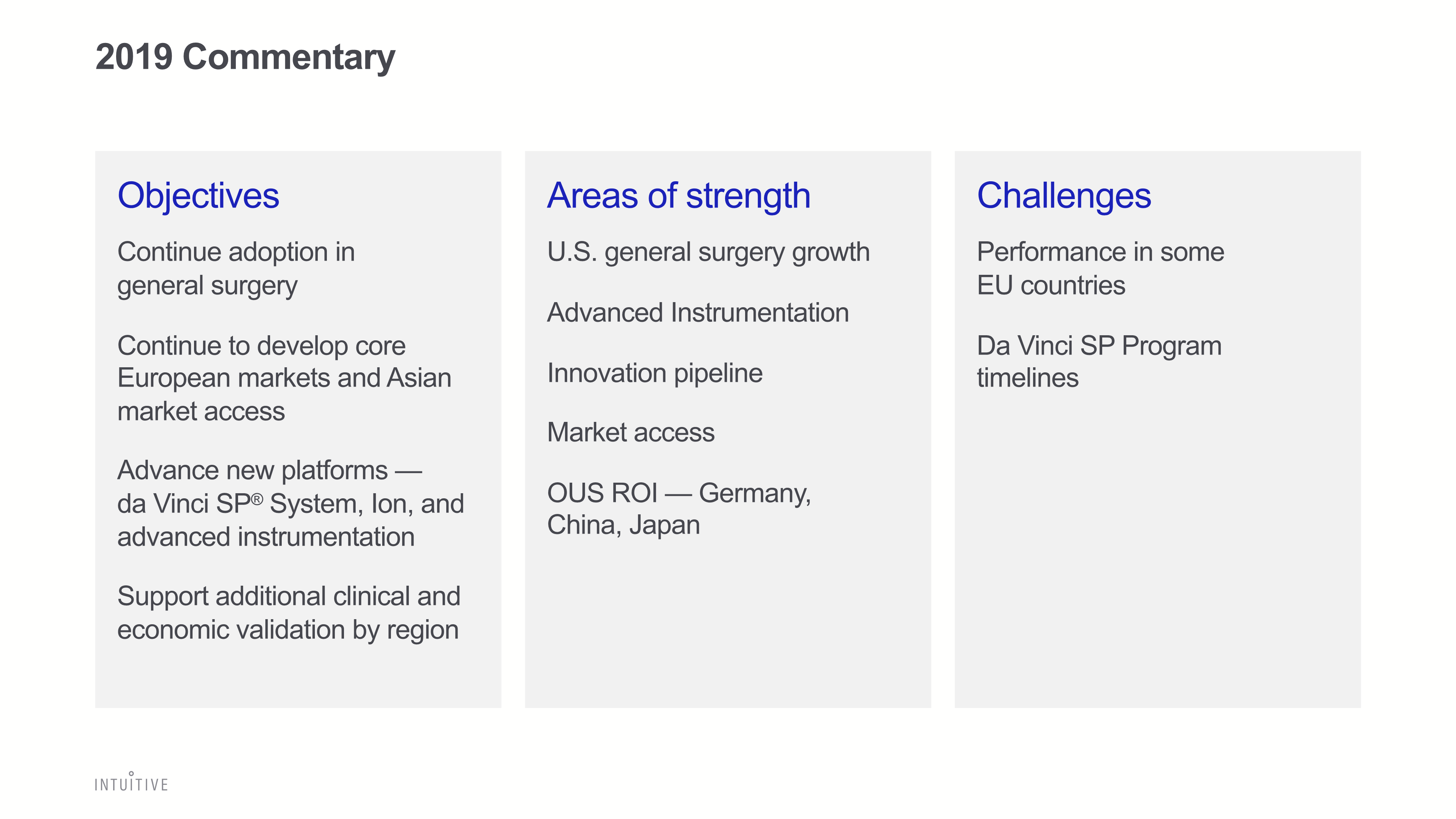 2019年公司有四个目标:(1)提升普通外科手术渗透率;(2)继续开发欧洲和亚洲核心市场;(3)推进新的平台——达芬奇SP系统,ION及先进仪器;(4)支持不同区域的临床和经济验证。