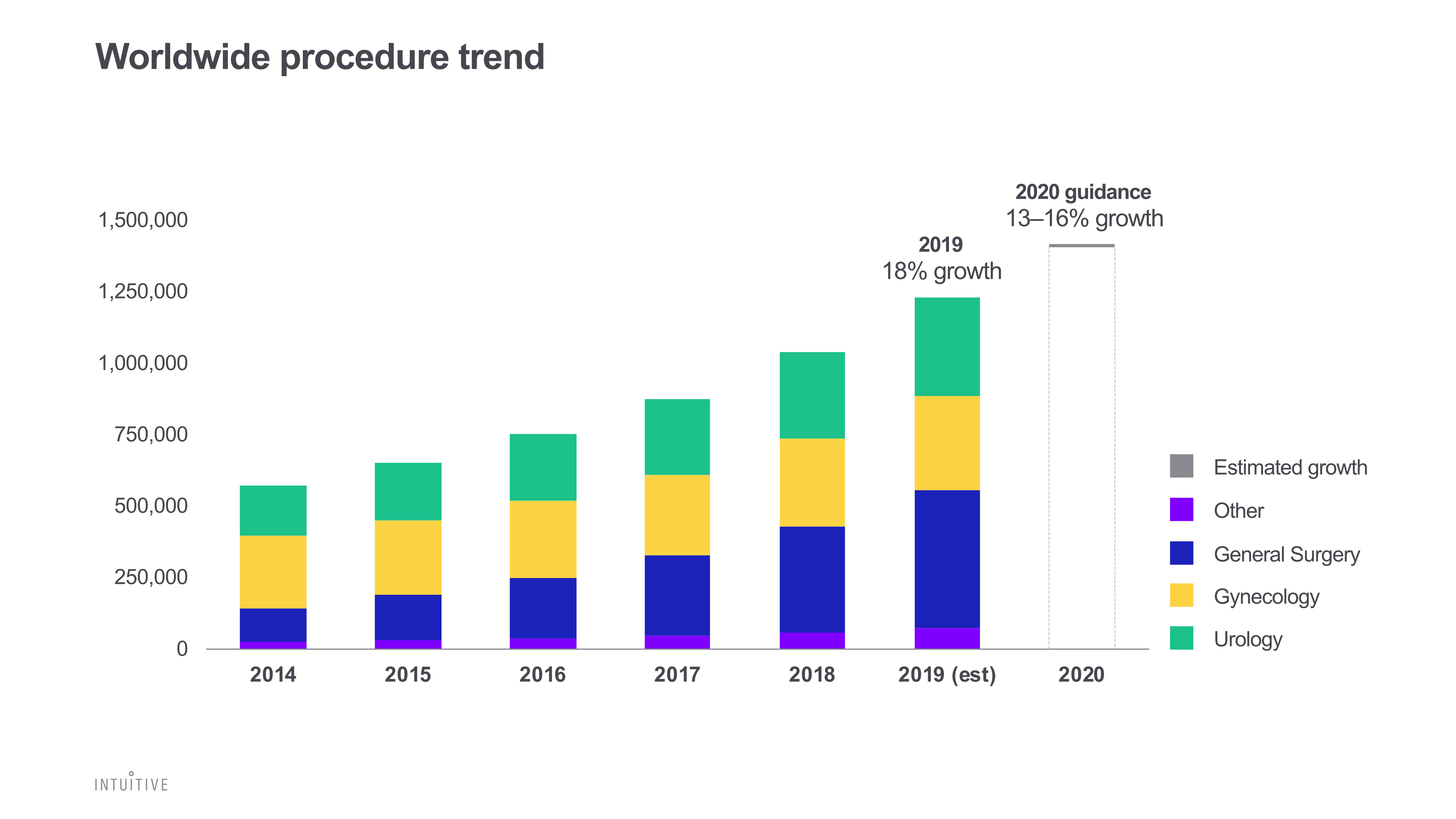 下面是直觉机器人公司全球手术的趋势,可以看到普通外科、泌尿科和妇科是目前达芬奇机器人的主要应用场所,其他类型的外科手术也在高速增长。2019年手术增长率约为18%,公司预期2020年的增速为13-16%。
