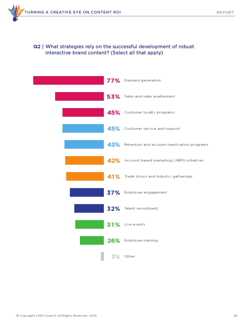 大多数场营销领袖(77%)表示,他们相信需求生成策略依赖于强大的互动品牌内容的成功开发。另有53%的受访者对销售和销售推动战略具有同样的看法。