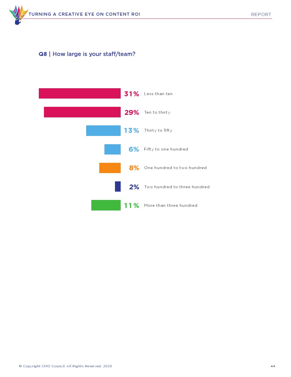 只有大约1/3的受访者(34%)认为他们的内容质量和影响是“很好的”,7%的受访者认为它是杰出的。相反,大多数受访者(43%)将他们的内容评为“中等”,因为使用的一些内容很好,能引起客户的共鸣,推动价值,还有一些是浪费预算。