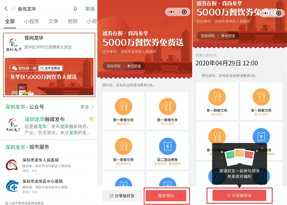 首期活动发放1000万元餐饮消费券,面额分别为满60元减30元、满100元减50元、满200元减100元。4月28日12:00到5月24日23:59期间,深圳市民可通过微信搜一搜“食尚龙华”或“龙华消费券”进入小程序,在主页点击预约,一次报名即可参加后续每期摇号。报名成功后还可一键分享,邀请好友共同享受福利。
