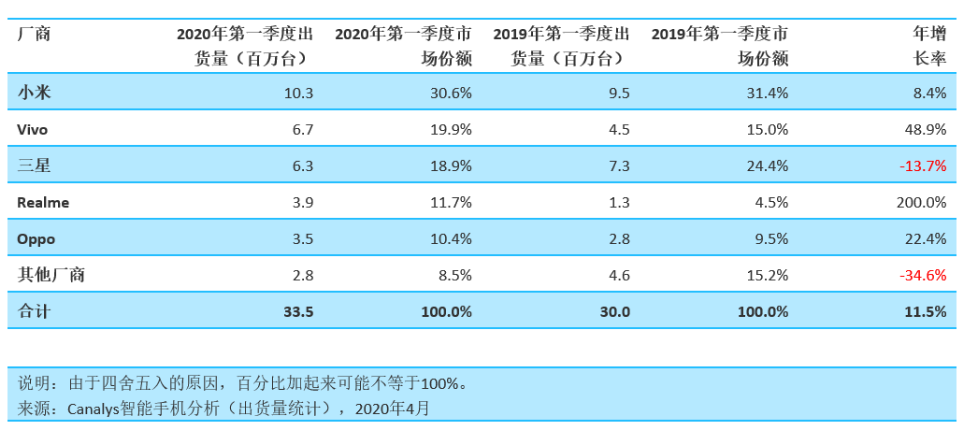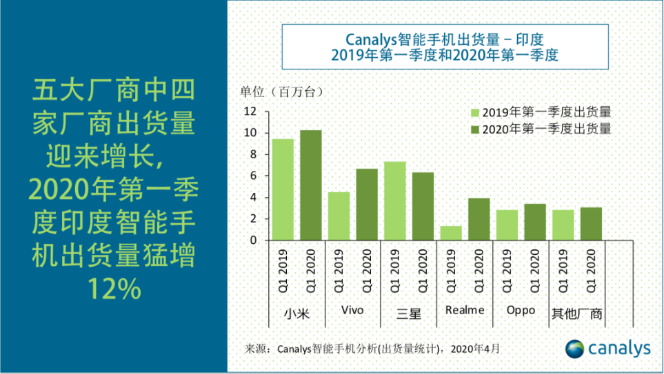 Canalys日前发布的报告显示,2020第一季度印度智能手机市场出货量增长12%至3350万台。