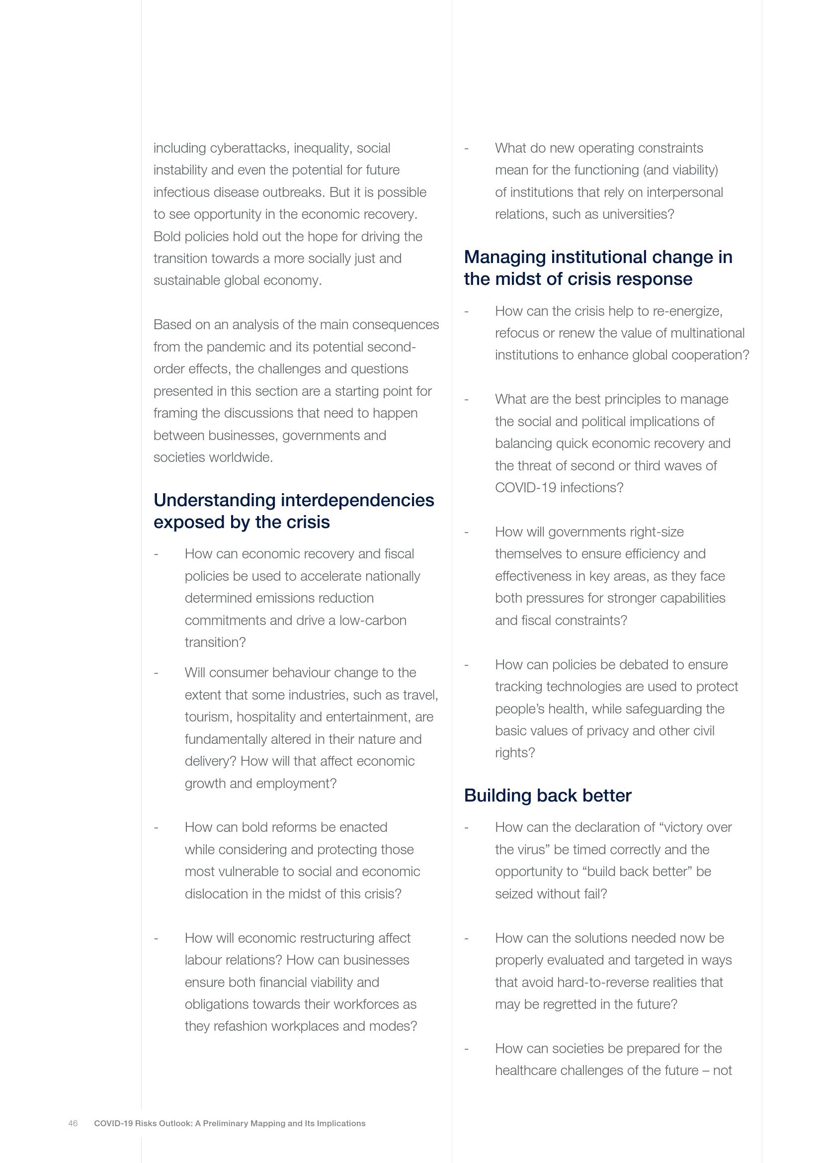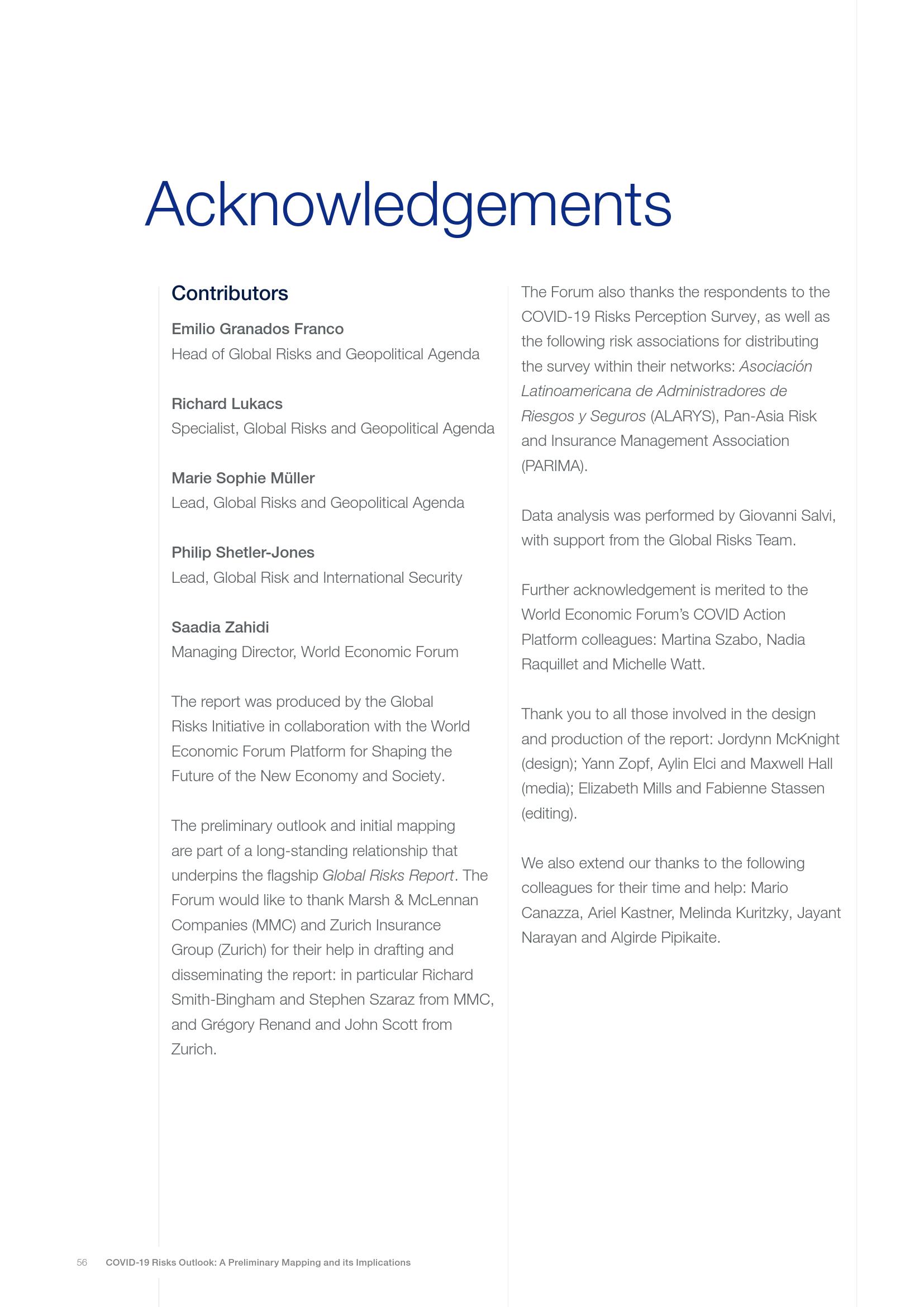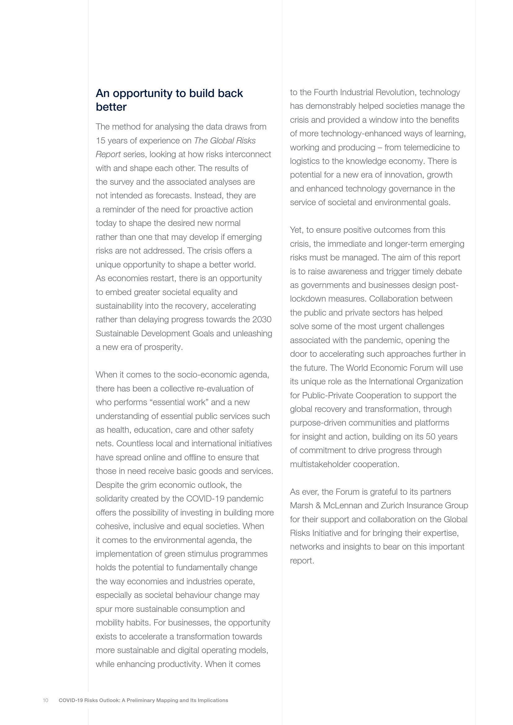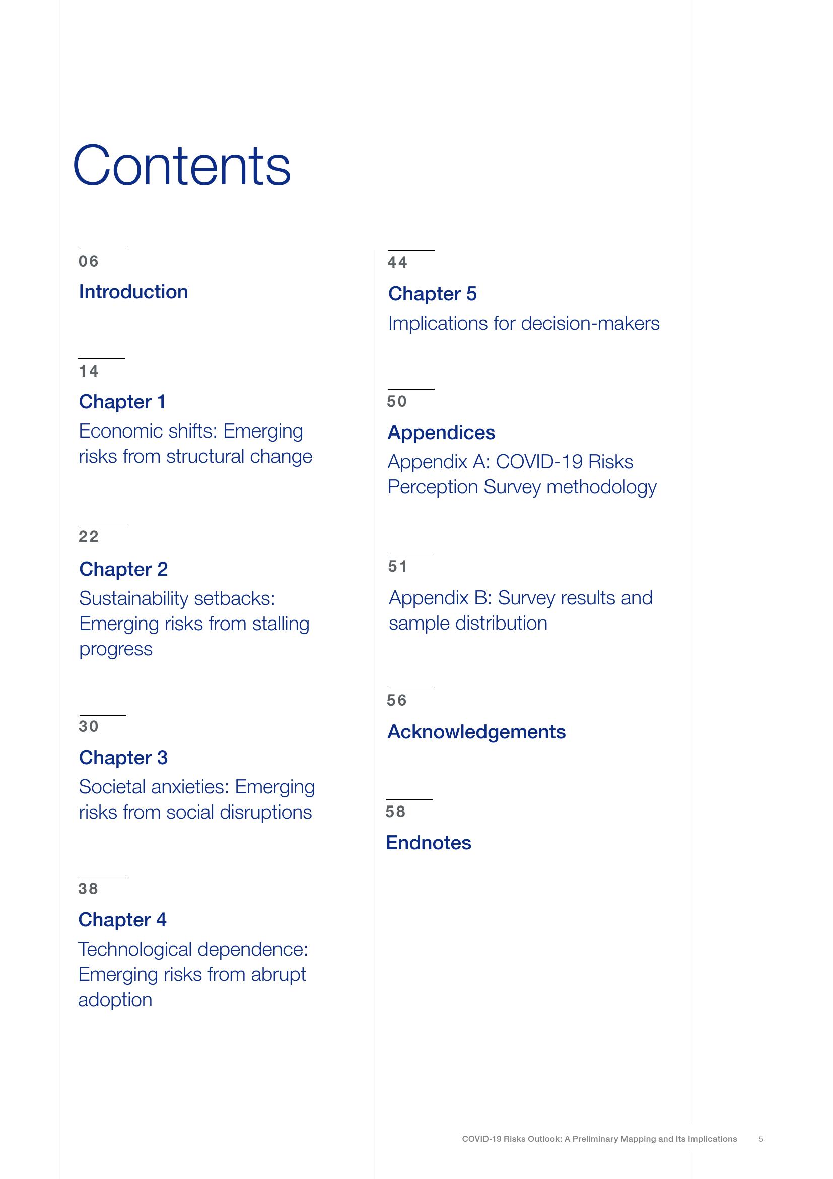 世界经济论坛执行董事萨迪娅·扎希迪(Saadia Zahidi)表示,在控制大流行病直接影响的同时,领导者还必须紧密合作,联合社会各界应对已知风险,并提高复原力来应对未知风险。“我们现在应当化危险为机遇,采用新思路与新方法,提高经济的可持续性、韧性和包容性。”