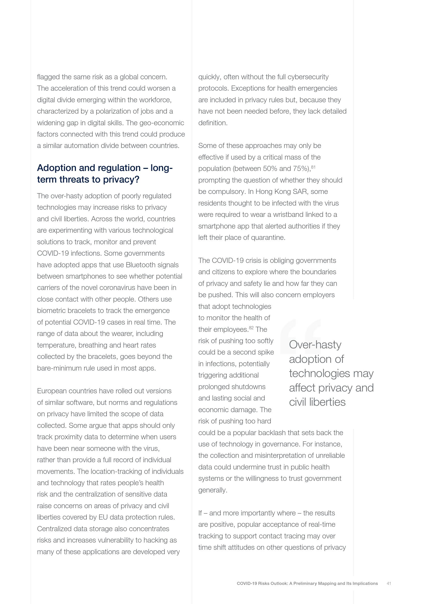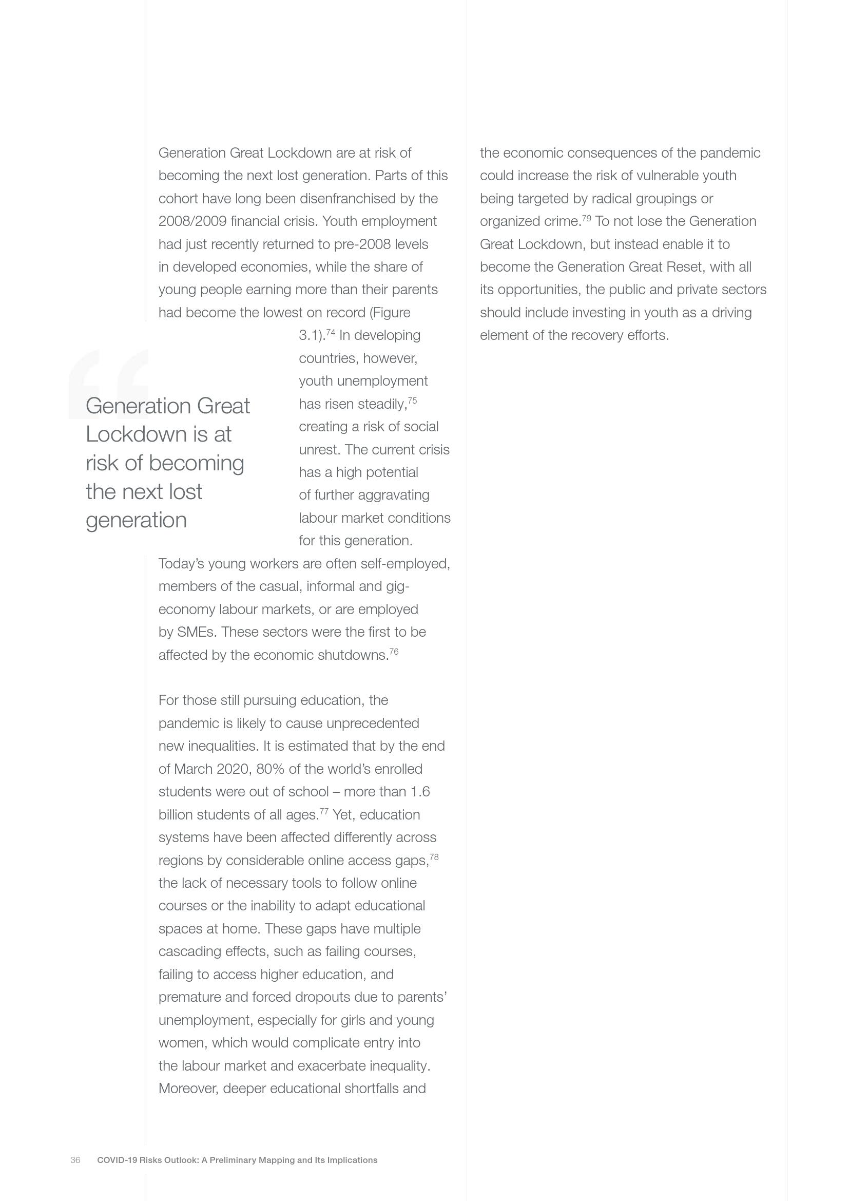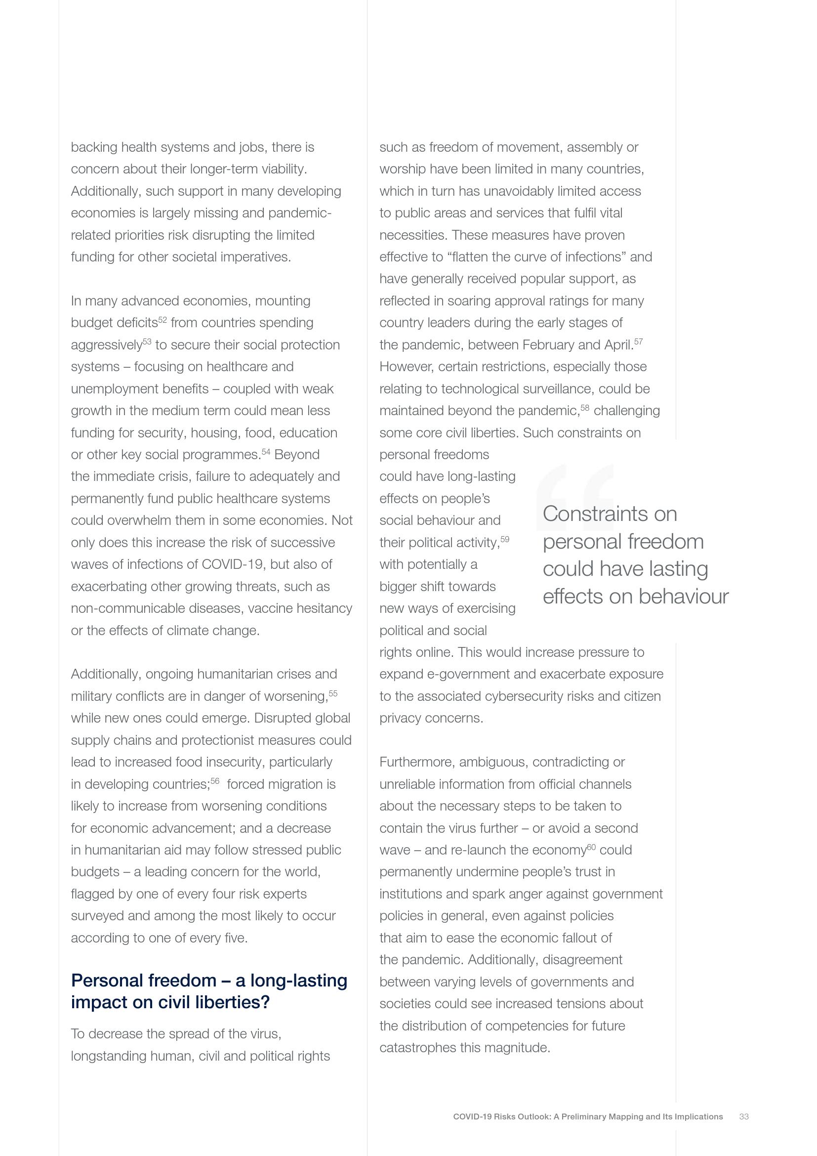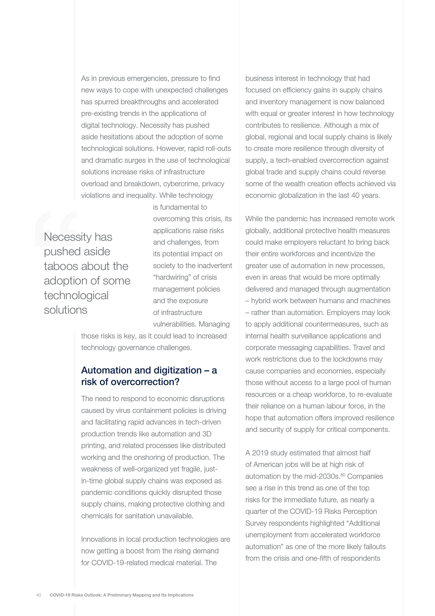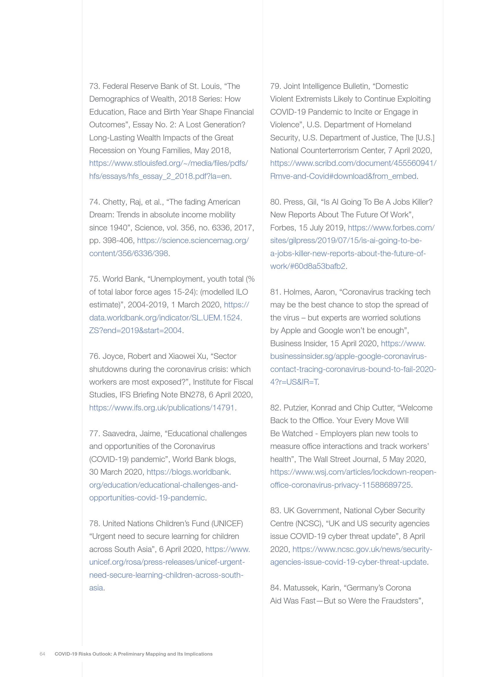 世界经济论坛执行董事萨迪娅·扎希迪(Saadia Zahidi)表示,在控制大流行病直接影响的同时,领导者还必须紧密合作,联合社会各界应对已知风险,并提高复原力来应对未知风险。“我们现在应当化危险为机遇,采用新思路与新方法,提高经济的可持续性、韧性和包容性。”