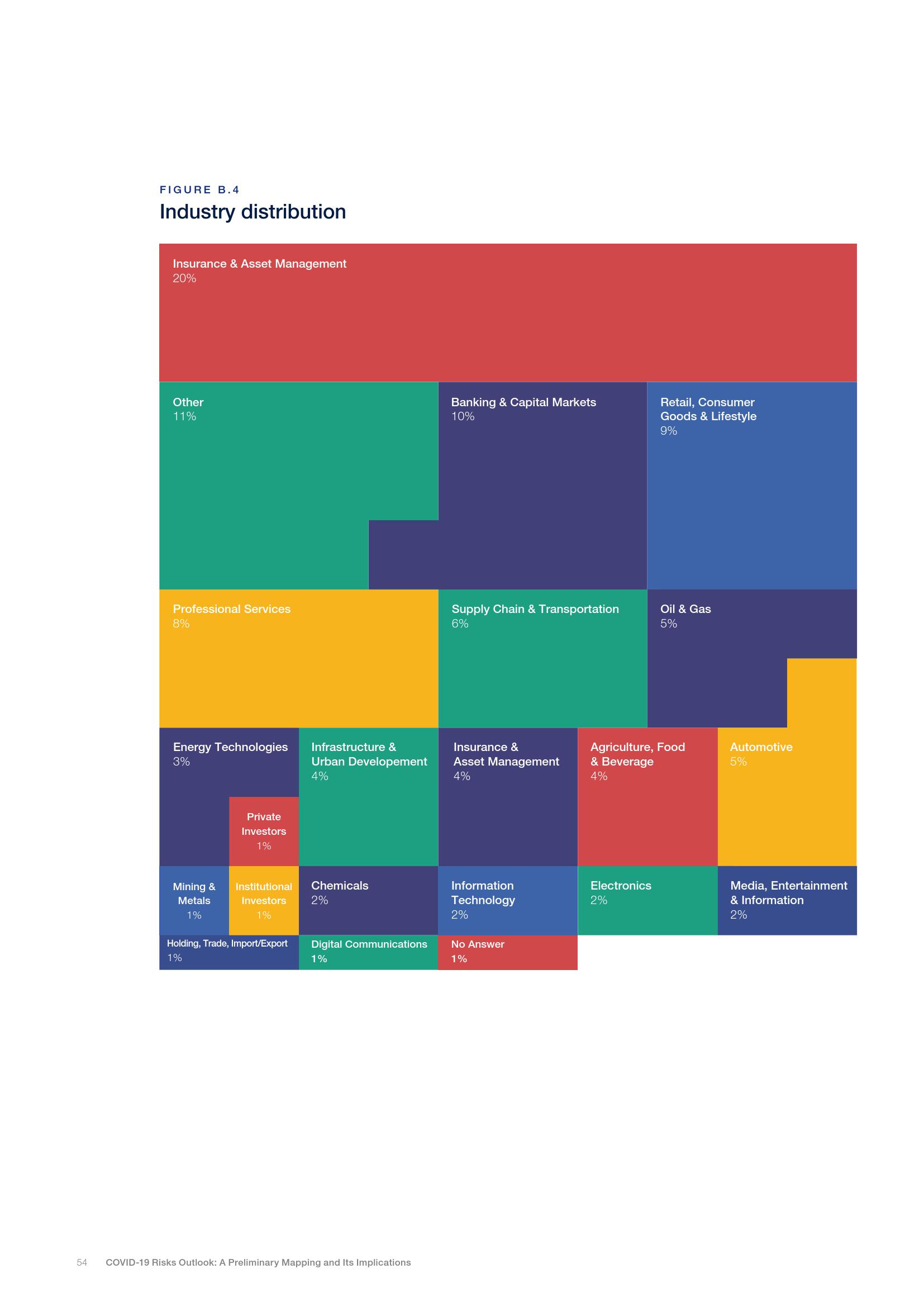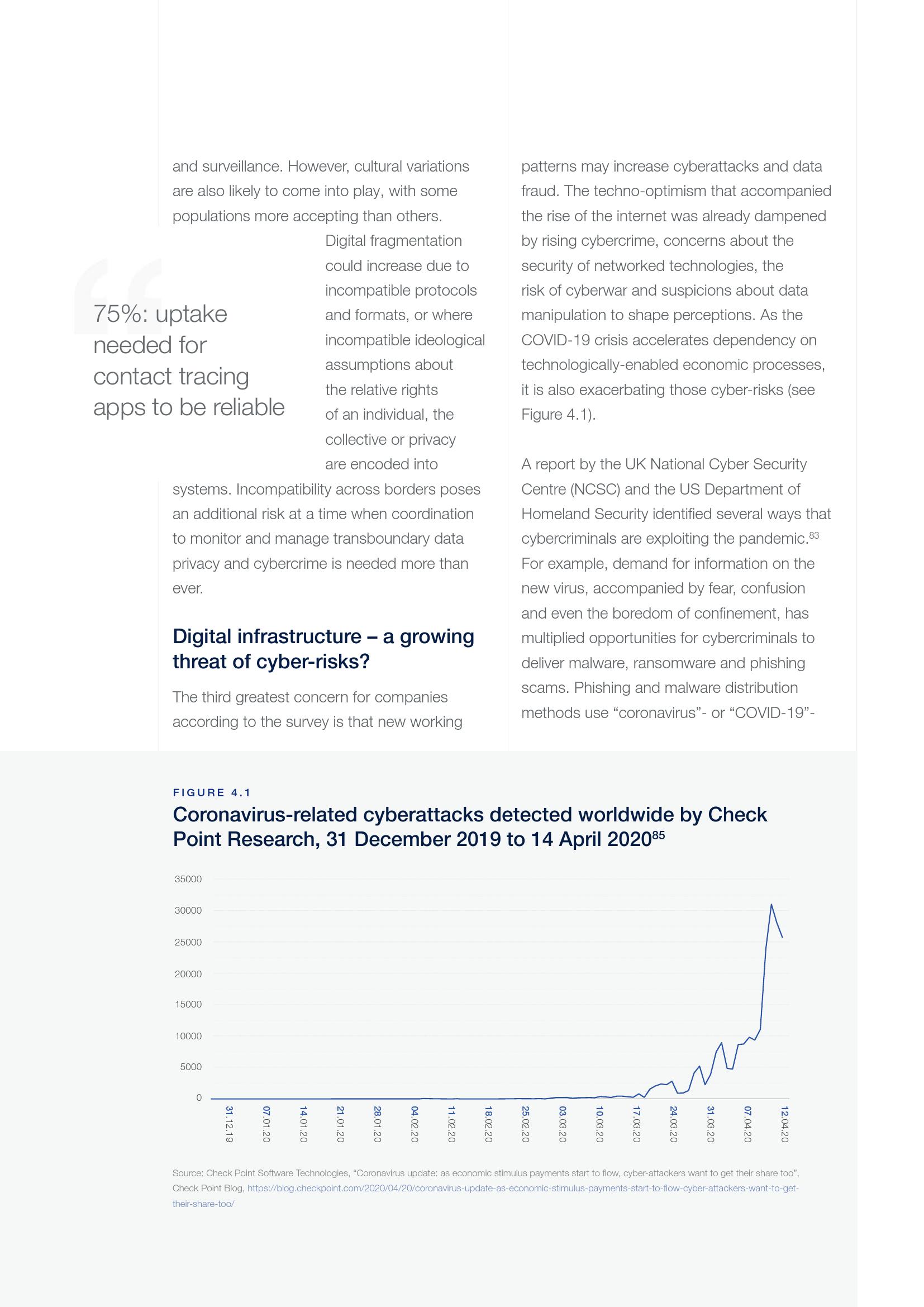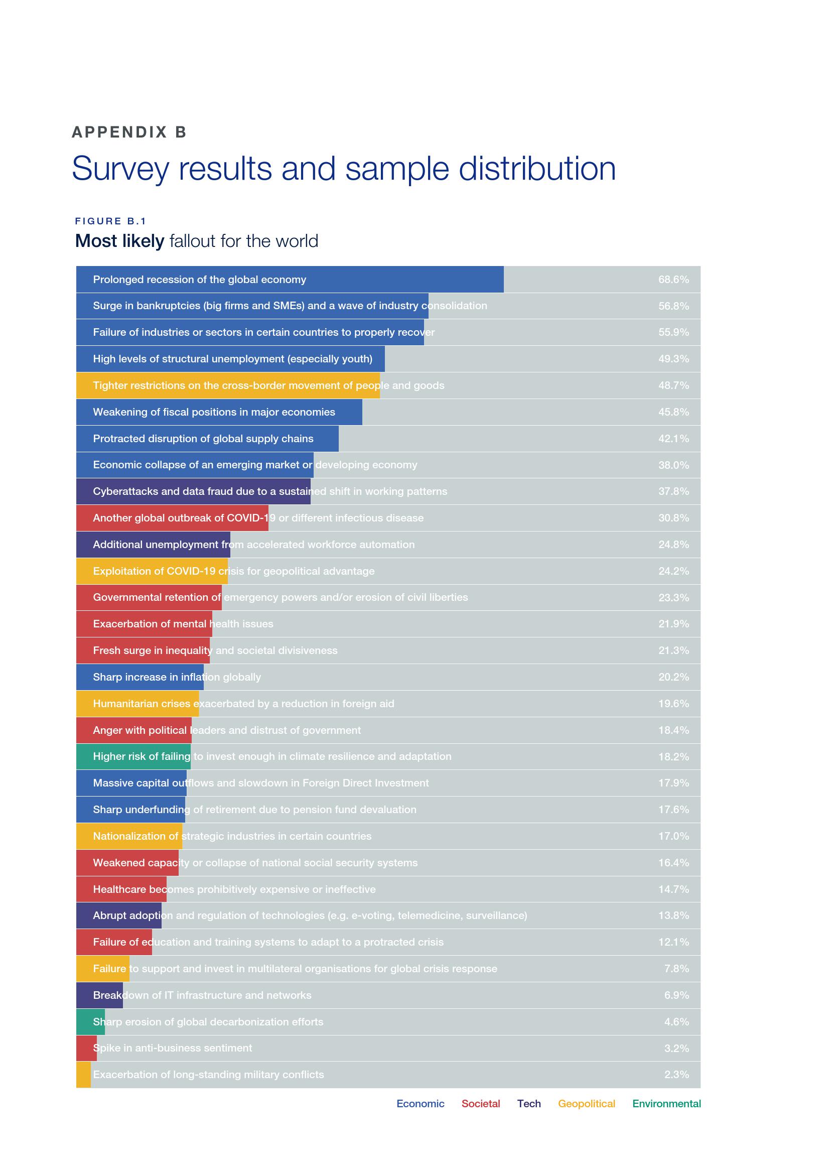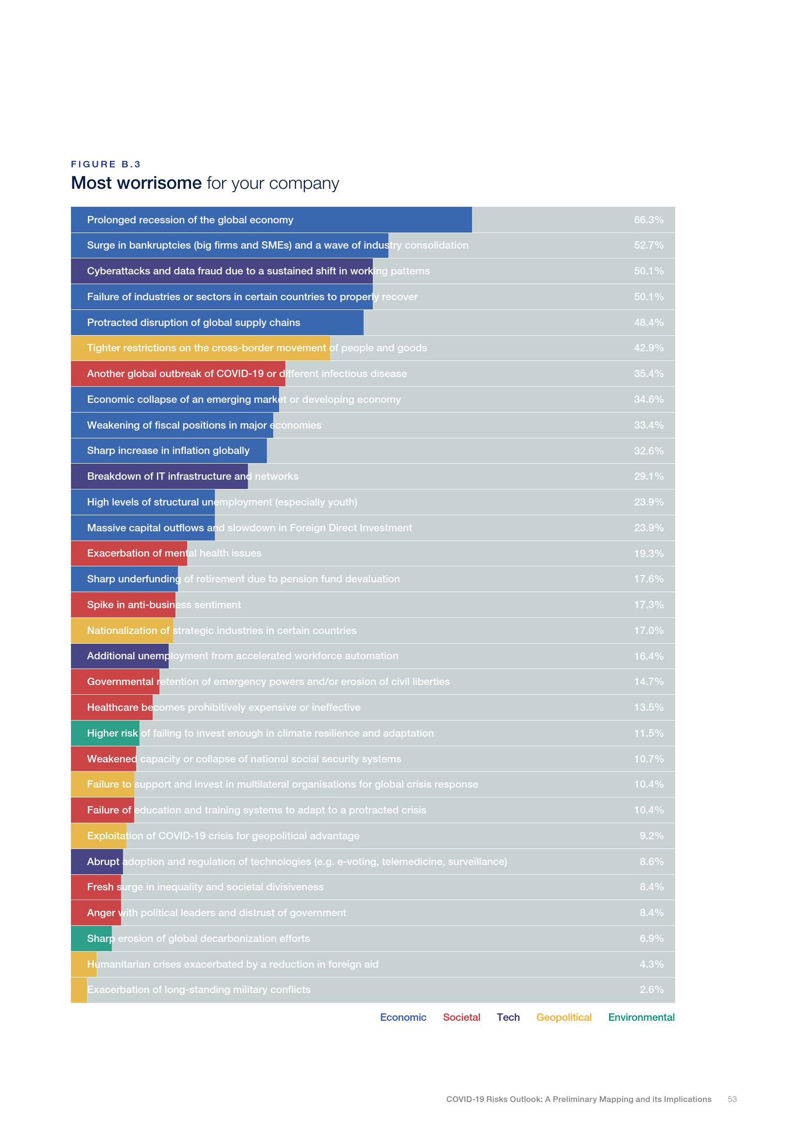 受访专家认为,最主要的风险在于新冠疫情带来的直接经济后果,包括主要经济体陷入长期衰退乃至财政状况恶化;跨境商品与人员流动进一步受限;主要新兴市场出现崩溃等。其中,三分之二受访者认为,全球长期衰退是企业面临的首要问题。一半的受访者表示非常担心破产和行业合并、行业无法复苏以及供应链中断。半数受访者认为,主要威胁还包括网络攻击和数据欺诈,而信息技术基础设施和网络故障也是他们最担心的情况。