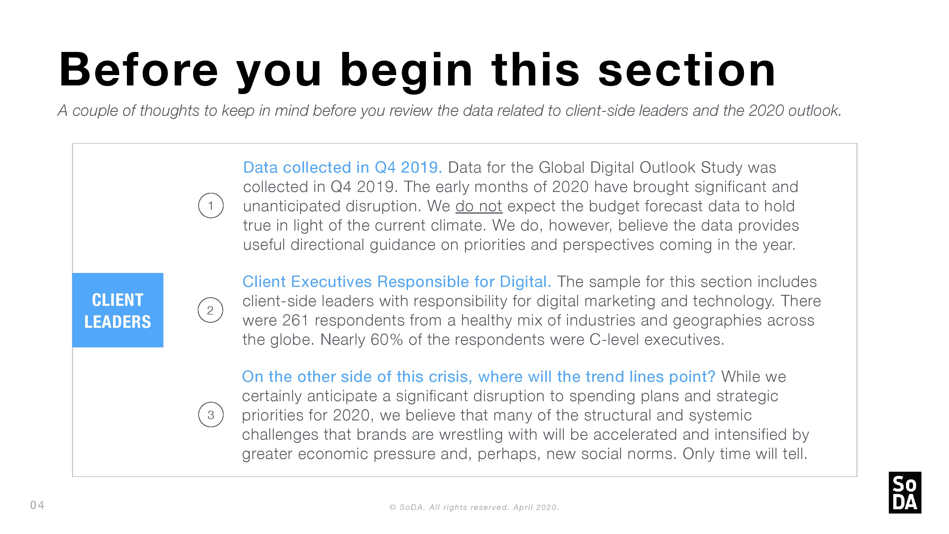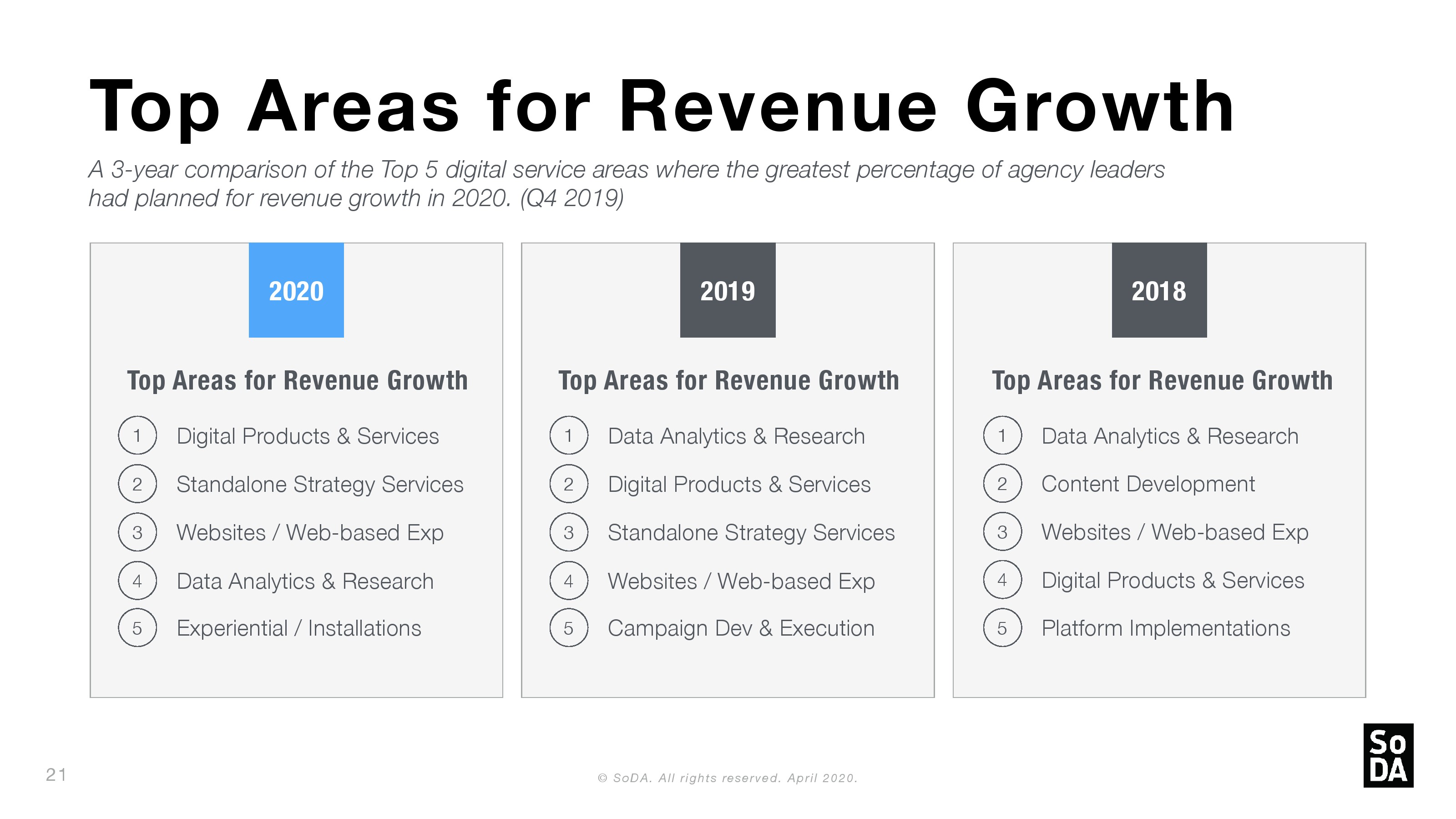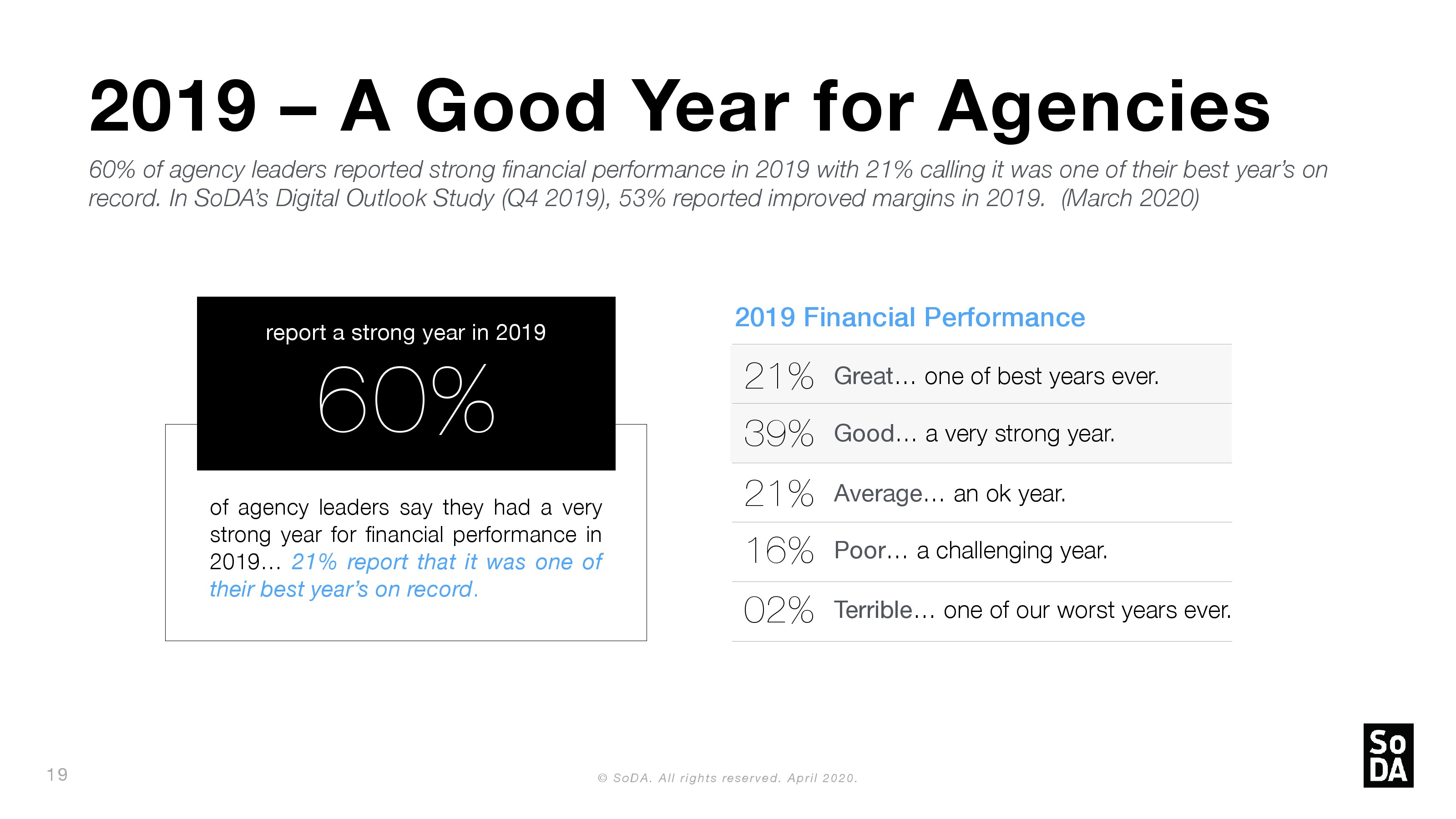 SoDA发布了新报告“2020年数字概览”。1/6的机构领导人认为他们在2019年表现强劲;约1/5的受访者(21%)表示,这是他们有史以来表现最好的一年。