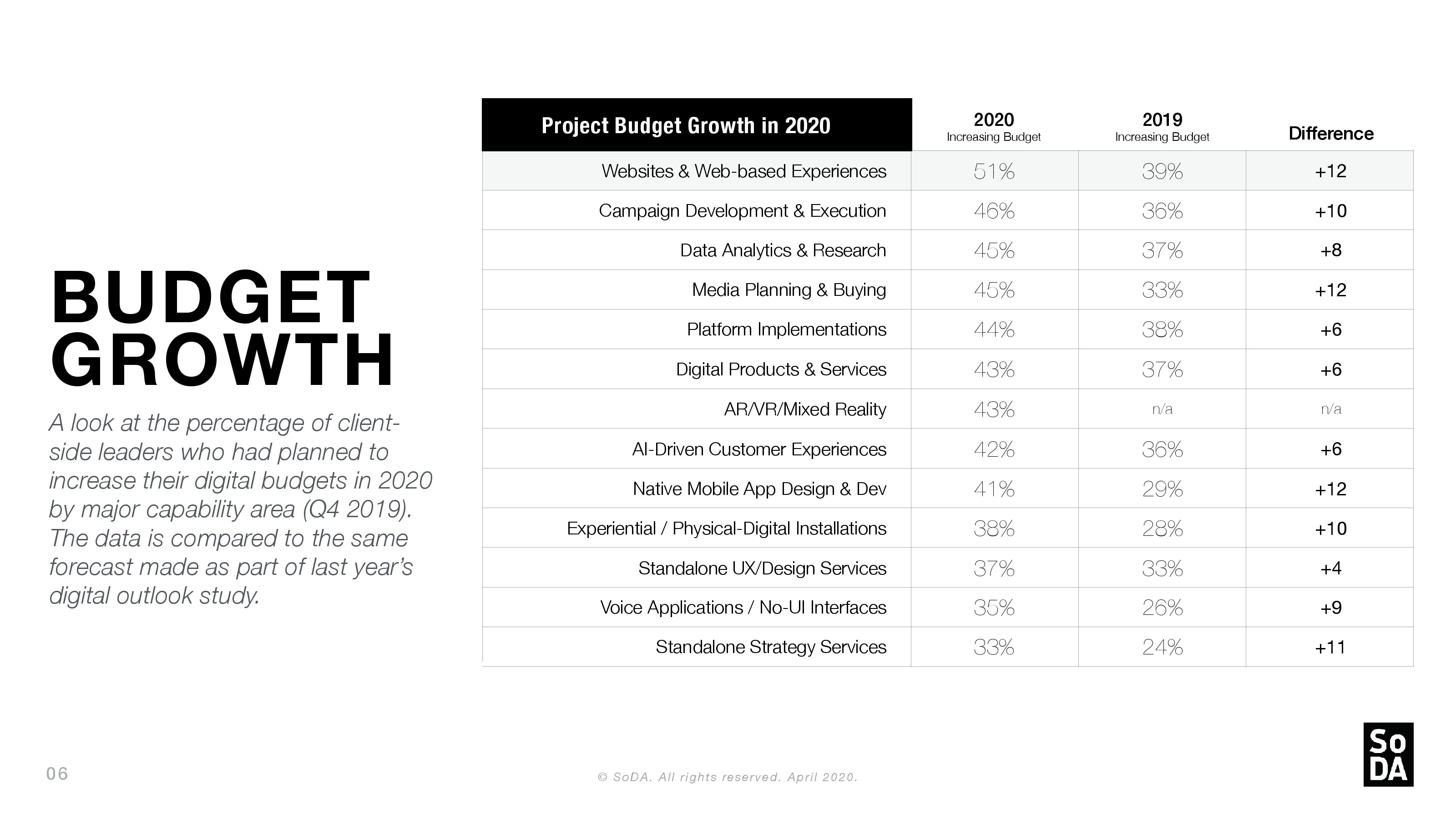 对2020年必须提供的服务持乐观态度的不仅仅是机构:客户端领导人还预计会增加网站和基于网络体验的预算(51%)、活动开发和执行(46%)、数据分析和研究(45%)以及媒体规划和购买(45%)等领域的预算。