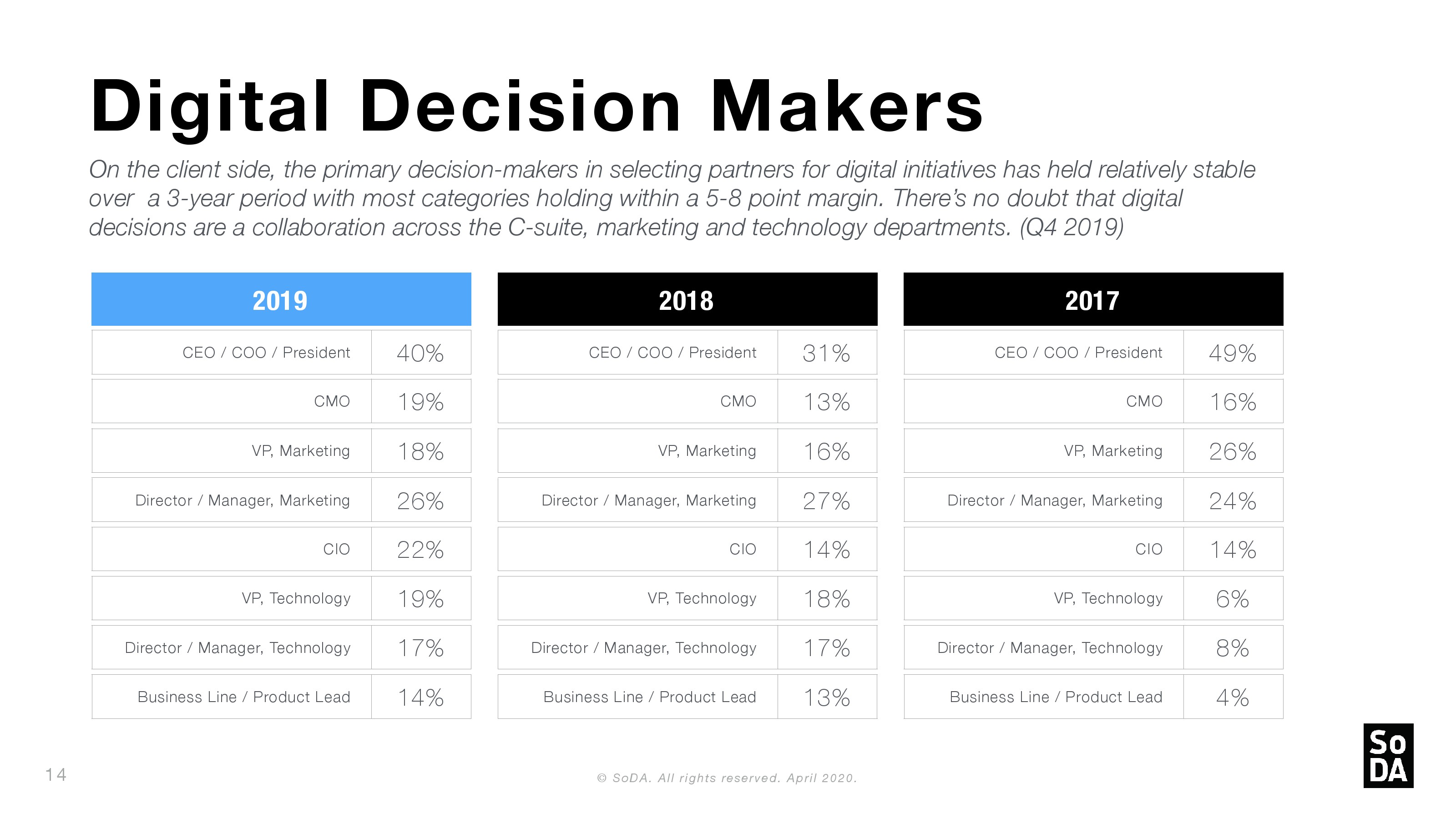 - 2019年,首席执行官(40%)、营销总监/经理(26%)和首席信息官(22%)负责选择数字计划中的合作伙伴。