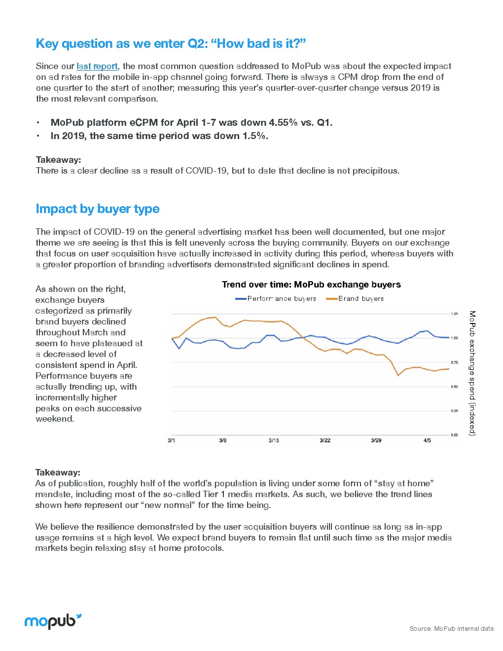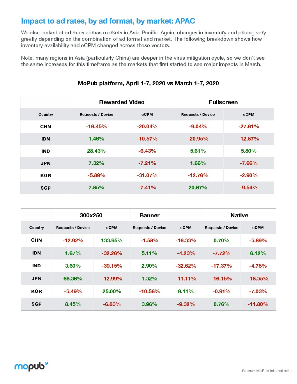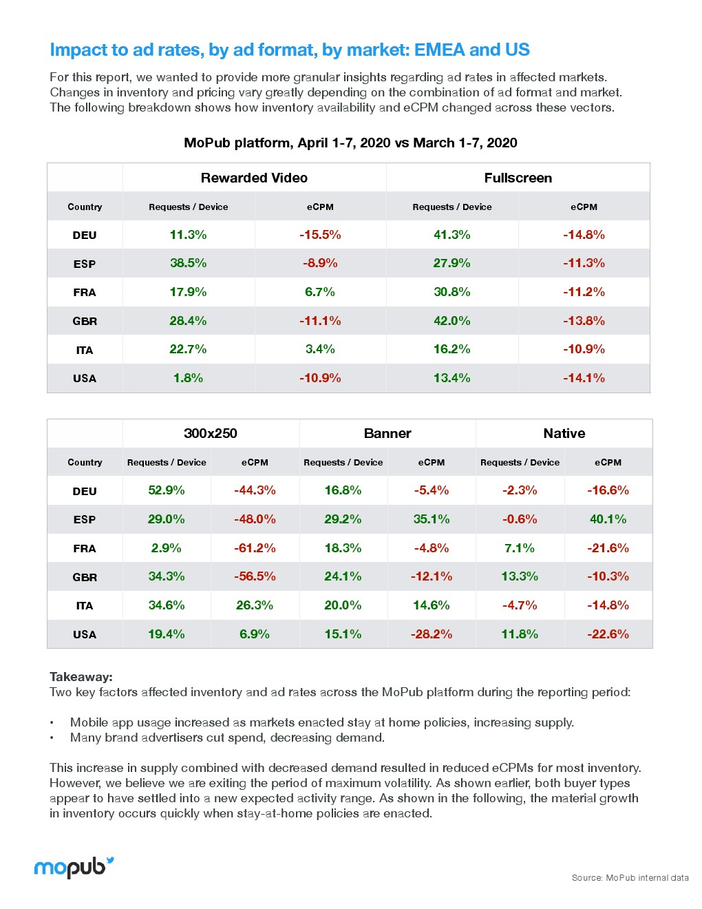 冠状病毒对一般广告市场的影响已经有了广泛的报道,4月1日-7日,MoPub平台上的eCPM(每一千次展示可以获得的广告收入)比第一季度下降4.55%。2019年同期eCPM降幅只有1.5%。