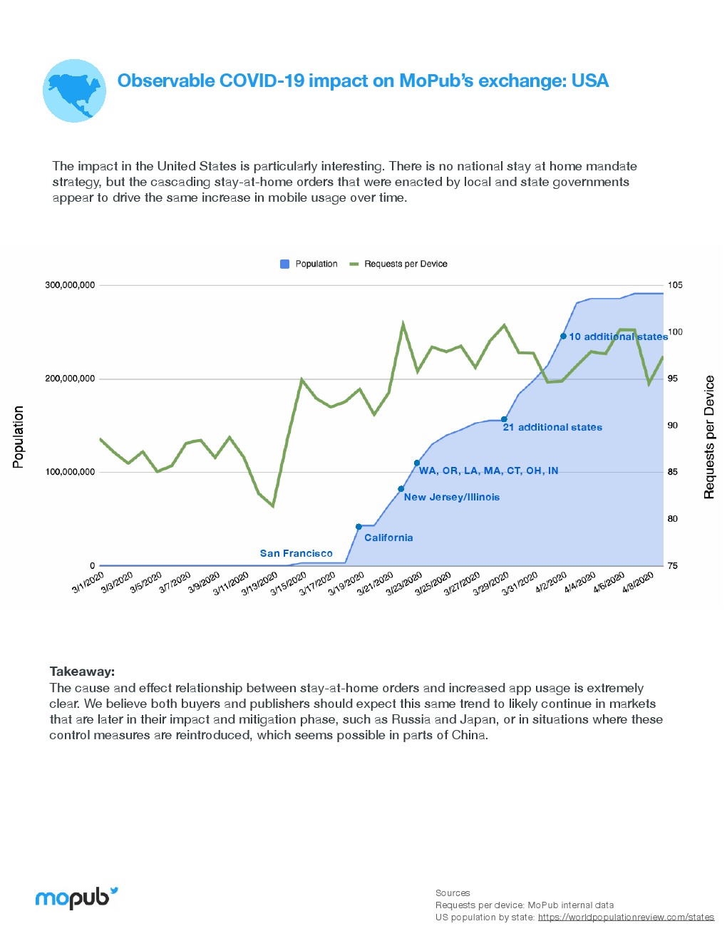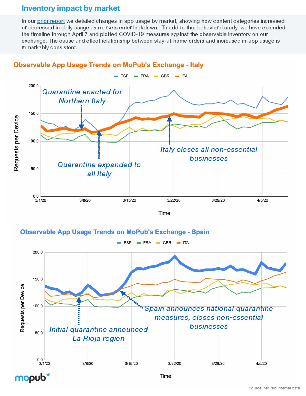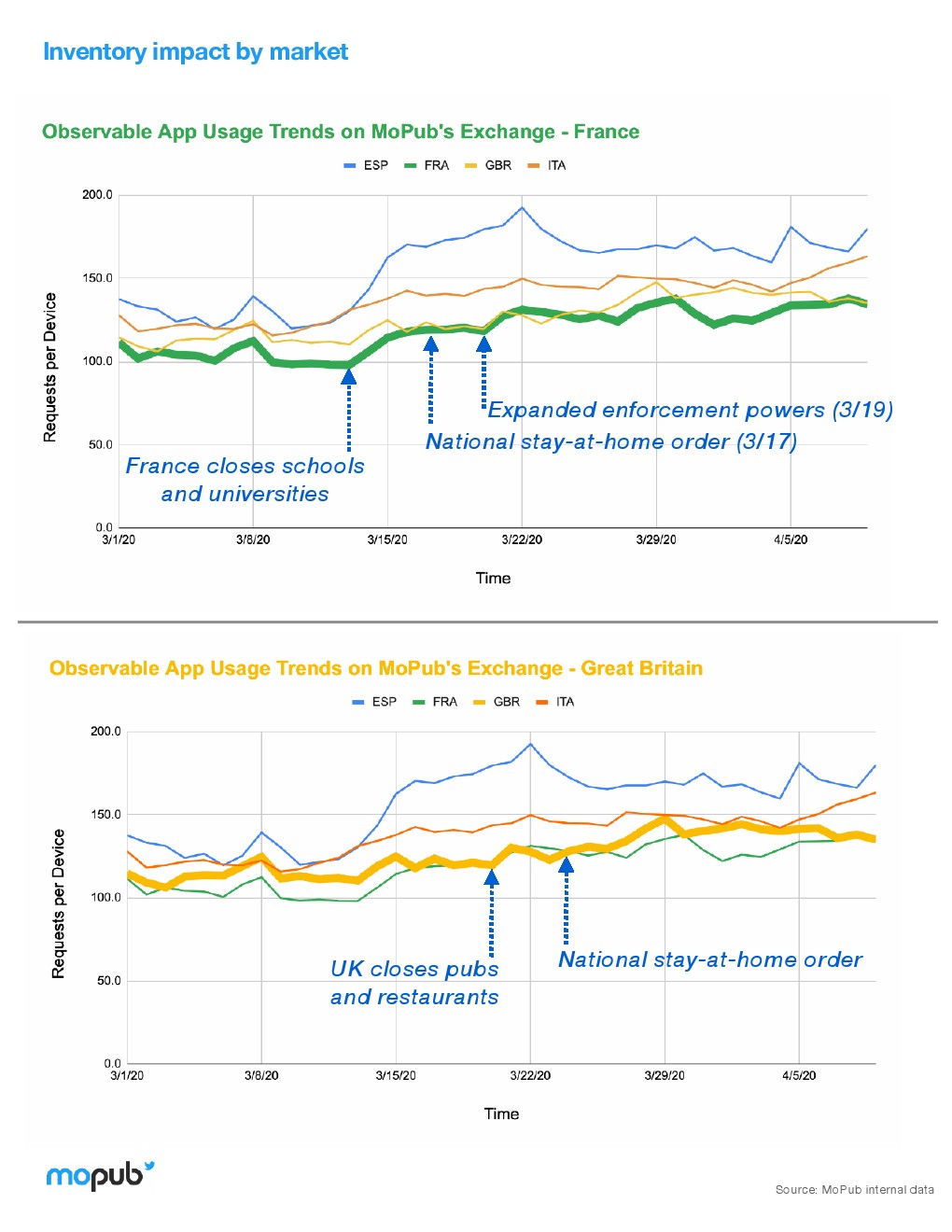 冠状病毒对一般广告市场的影响已经有了广泛的报道,4月1日-7日,MoPub平台上的eCPM(每一千次展示可以获得的广告收入)比第一季度下降4.55%。2019年同期eCPM降幅只有1.5%。