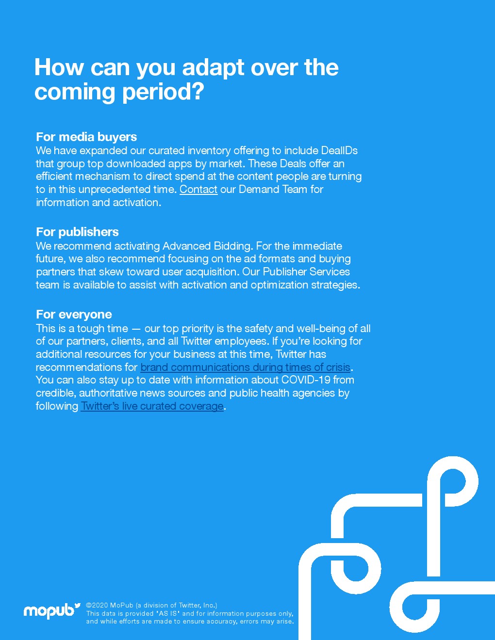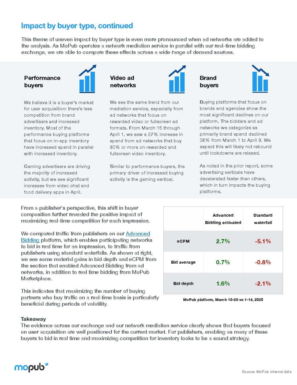 品牌广告买家:那些以品牌和广告代理商为对象的购买平台下滑明显。3月1日-4月9日,品牌广告买家支出下降36%。MoPub预计封锁放松之前都不会有所反弹。值得注意的是,有些广告垂直行业比其他行业下滑的更快,这也影响了买家平台。