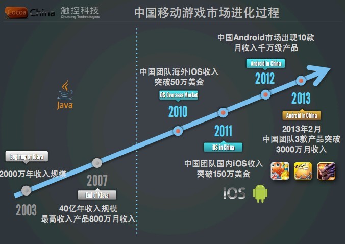 CocoaChina2013(春季)开发者大会现场,触控科技CEO陈昊芝表示“2008年以前智能机市场真正开始发展,Java游戏主要市场,平台主要是运营商,从2千万人民币的收入规模到2007年近40亿。从2003年到2013年,10年前手机游戏市场是全年2千万人民币,而到2013年中国手游市场规模将达到80亿,2015年这个市场将达到240亿。”