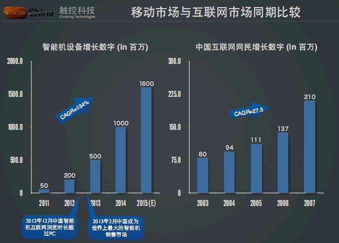 这两张图表(PPT)实际上含金量并不大。但是它是一个思维方式,这种思维方式指的是什么呢?这是移动互联网从2011年我们知道职能机设备达到5千万台,这是当年的市场存量。到2012年去年的统计,中国有2亿台智能机,今年我们看到2013年的2月份中旬,在2013年过了45天之后发布了一个新的数据,中国的智能机是2.45亿台。也就是说,进入2013年以后,中国每天增加100万台智能机。而我们看2003年到2007年中国的互联网网民的增长,2003年中国所有的互联网公司开始盈利,当时是因为有运营商的SP业务。但是从2003年到2007年经过5年的时间,中国网民才增长到2.1亿。也就是说,我们在智能机市场用了1年的时间从5千万涨到2亿台的设备数,进入我们今天面对的一个市场。假设我们最保守的估计,在过去的2011年、2012年到今年2013年,用户的增长至少是每年3倍的状态。可能从今年开始,这个用户增量会降到百分之百,明年会降到60%,但是设备数会继续快速增长。