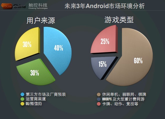 陈昊芝认为未来三年Android市场用户来源,40%来源于第三方市场及厂商预装,30%来源运营商渠道,30%来源QQ、微信等平台。在游戏类型方面休闲单机、弱联网、棋牌游戏占市场60%、MMORPG及大型重度计费网友市场仅为15%,卡牌、动作、竞技游戏规模为25%。未来承载用户量最大游戏将以轻度、休闲、全面娱乐形为主,这点可以从《找你妹》、《保卫萝卜》以及《捕鱼达人》的成功借鉴。