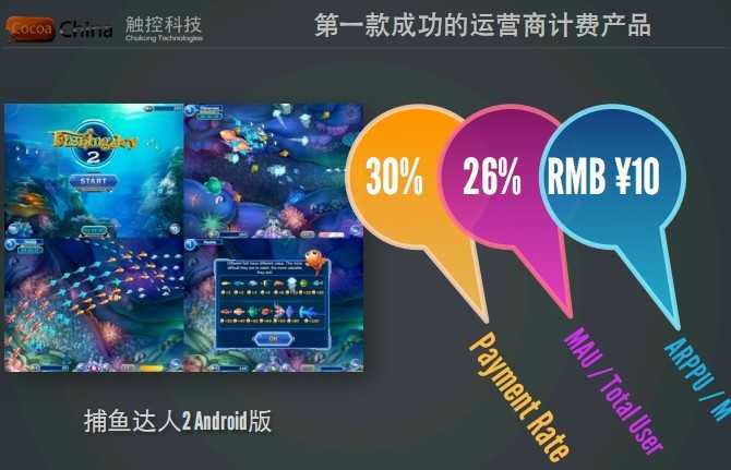 下面会具体讲一下我们在几个市场的一些经验。这里有三个数字,30%、26%和10块钱人民币,捕鱼达人2第一款在运营商计费模式下成功的产品,为什么说是第一款?因为在捕鱼达人2之前有产品在运营商上面运行,捕鱼达人2之后会有。成功核心讲的是收入规模,这款产品从500万、1千万到3千万,一共走过5个月的时间。而且它完全使用的是运营商的计费能力,同时也是第一款在运营商本身的资源上获取有收入发生的产品,所以我们说这是第一款运营商计费模式下成功的产品。30%是指我们的产品在上线的初期付费率30%以上。26%是指什么?就是捕鱼系列全部的下载,把月活除以全部的下载,我的活跃率是26%。也就是说,像捕鱼达人1和捕鱼达人2,它的一百天的用户留存可以达到20%多。运营商对于手机游戏的产品,尤其是有计费限制的,单用户、单天、单产品最高收10块钱,到目前其实这依然是一个限制。而捕鱼我们的日活跃用户日付费是9.8元到9.9元。也就是说,我们完全把运营商在这个产品的计费能力和计费空间占了,这个市场有一个非常大的特殊性,就是说你的计费完全是基于这个计费通道的特征设置的,而且有非常高的付费成功率。今天捕鱼达人2的付费率已经在13%到17%了,因为我们取消了去年上线的时候用的激活付费的方式,我们现在变成免费,只用IP的方式做收入了。但是仅用IP的收入,其实比之前用激活的方式的确低了一点,但是依然在2千多万到3千万的市场规模。