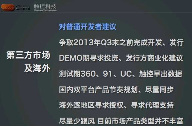 下面是我最中肯的对于这个行业里面普通开发者的建议。2013年Q3末之前,我建议大家不必把产品完成开发、发行、上线。为什么?我们在这个行业应该算是跑得比较快的,所以我们看到好的现象和不好的现象。好的现象是今天一款产品还没有正式的成绩,只要这款产品品质靠谱,开发的团队背景靠谱,产品后期的思路和内容准备靠谱,说实话,有百万级的版权费就能够打过去,今天就有这种现象。到Q3这种现象会进一步加剧,到Q4这个市场会出现一个我们不太愿意见到的情况,就像2005年、2006年、2007年韩国的那种状态一样,一个产品还没有开发完,就已经有多家进来在抢占。而韩国当年多数的还没有做完就开高价抢到的产品,最终基本上都没有完成上线,多数都废掉了。所以我说,如果今天大家希望做手机游戏真正去面对市场,Q3之前把产品放一放,如果今天是考虑拿一笔授权金和MG,然后就跑路,Q4之后有大的机会,这是我直接的一个说法,Q4中国手游市场会有很大的泡沫,而同时今天很多的端游和页游公司经过今年上半年的尝试,经过下半年的尝试,基本上也找到自己的方向了,所以产品的竞争压力会进一步加大。谁也不知道Q3会不会有7千万到1个亿月充值收入规模的游戏出现,当一个品牌收入一线、用户规模一线的产品在市场上出现两三款的时候,用户的消费关注一定会集中,到那时候小产品机会就越来越少。所以2013年的Q3末是很关键的一个时间点。