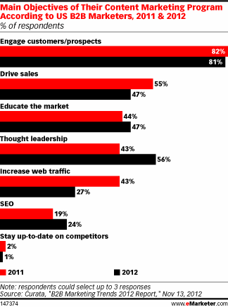 内容营销协会(CMI)和MarketingProfs在2012年8月发布的一个报告,发现超过十分之九的北美B2B营销人员开展内容营销。CMI是一家推动营销人员完成内容营销流程的咨询公司。该报告受在线视频网站Brightcove赞助。