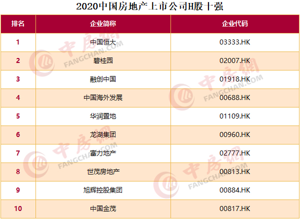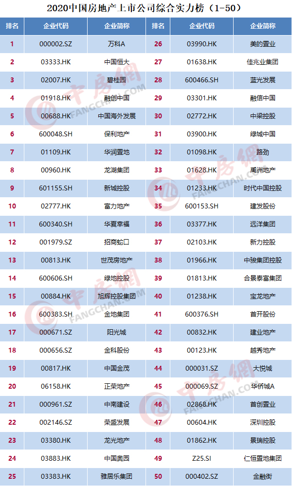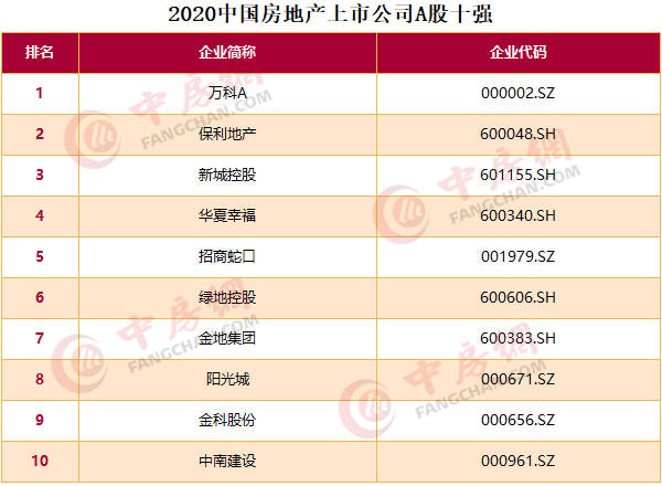 报告显示,2020年中国房地产上市公司综合实力榜前十强企业整体没有变化,仅排名出现微调。万科、中国恒大、碧桂园排名前三,融创中国跃升至第四,中国海外发展位居第五,保利地产排名第六,华润置地、龙湖集团、新城控股、富力地产分列第七至第十位。