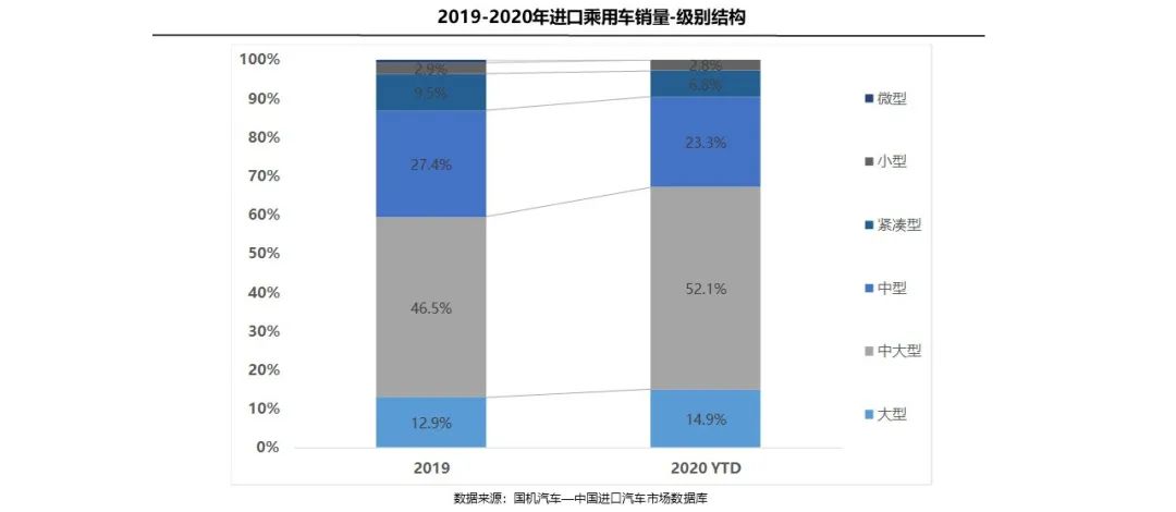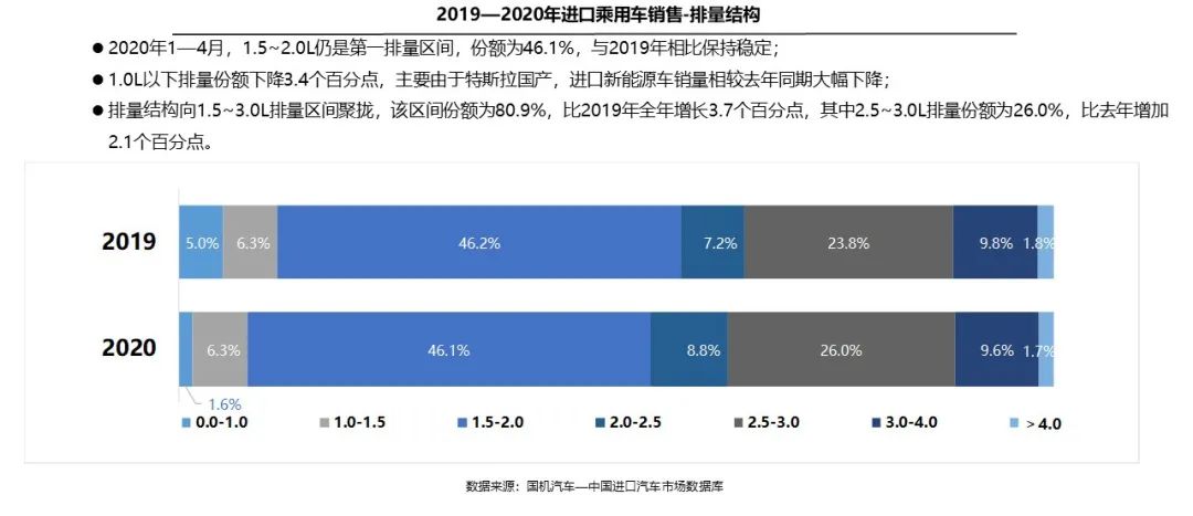2020年1—4月,1.5~2.0L仍是第一排量区间,份额为46.1%;1.0L以下排量份额受到特斯拉国产化的影响下降3.4个百分点;排量结构向1.5~3.0L排量区间聚拢,该区间份额为80.9%,比2019年全年增长3.7个百分点。