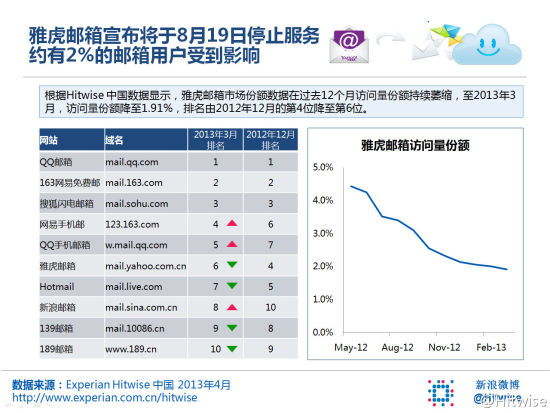 互联网数据统计机构Hitwise公布的数据显示,中国雅虎邮箱停止服务将影响我国2%的邮箱用户。中国雅虎邮箱的访问量份额过去一年中持续萎缩,目前已降至1.91%,排名由2012年12月的第4位降至第6位。