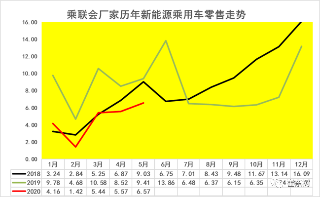 从乘联会的零售数据看,2020年5月份,今年乘车零售达到5.6万台,相对于19年5月份的走势大幅下降,但是相对18年5月份的走势表现还是很不错的,尤其是在19年15月份零售达到13万台的基础上,2020年1月份总体来看没有实现剧烈的负增长,5月下滑幅度远高于传统车,但主要是需求因素,体现新能源乘用车还是有一定需求的。