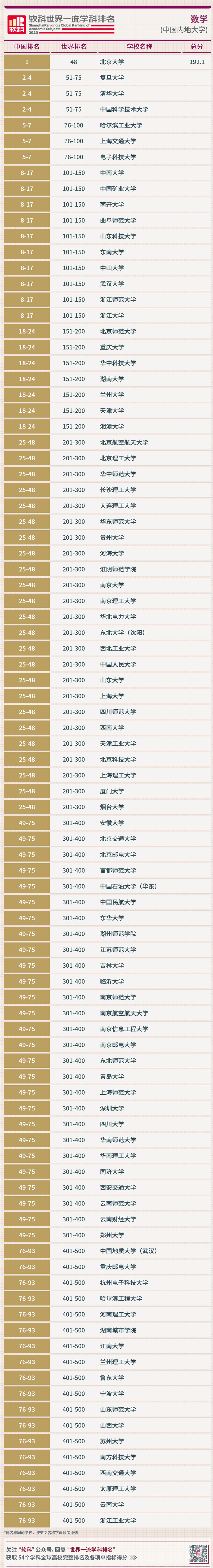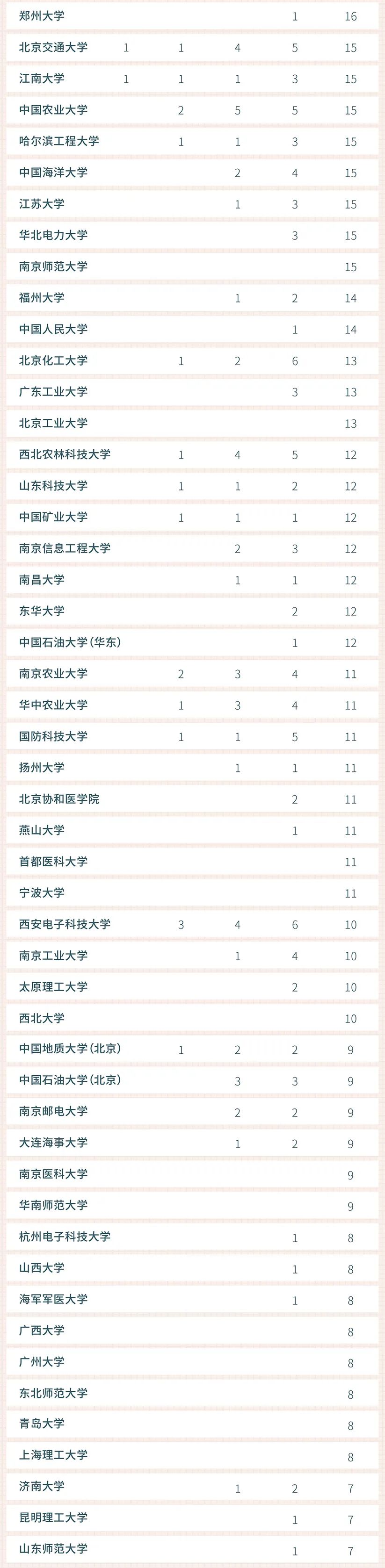 从中国内地高校的上榜学科数量来看,北京大学最多,共计47个学科上榜。中山大学、浙江大学、清华大学和武汉大学分别以45次、44次、43次和42次上榜数分列前五。此外,北京大学有32个学科位列世界百强,也是中国内地高校中百强学科数量最多的高校。值得一提的是,清华大学有13个学科跻身世界前十,是中国内地高校中前十名学科最多的高校,上海交通大学和浙江大学也分别有7个和6个学科位列世界前十。