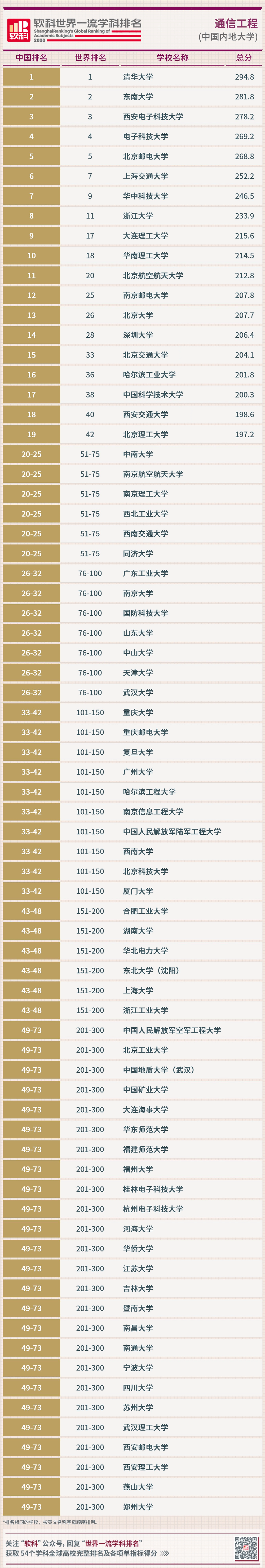 2020软科世界一流学科排名中,中国内地高校表现强劲,在10个学科夺得世界第一,分别是清华大学(通信工程)、哈尔滨工业大学(仪器科学)、同济大学(土木工程)、上海交通大学(船舶与海洋工程)、武汉大学(遥感技术)、北京科技大学(冶金工程)、北京航空航天大学(航空航天工程)、北京交通大学(交通运输工程)、江南大学(食品科学与工程)和中南大学(矿业工程)。