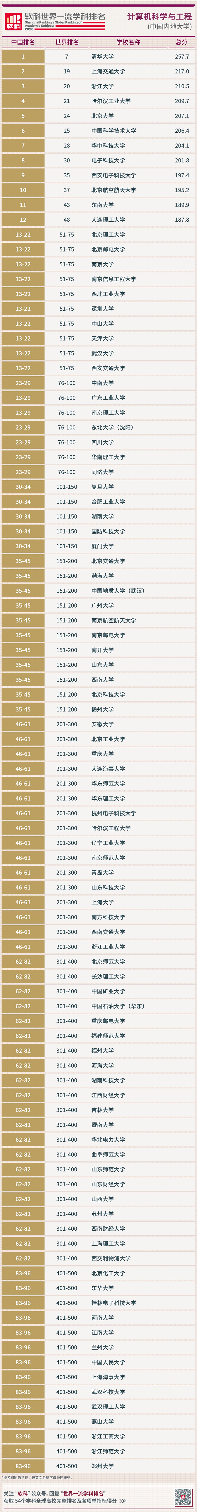 中国内地高校在工学领域表现强势,在18个工学学科的世界五十强中,中国内地高校的数量超过10所,分别是仪器科学(25所)、化学工程(21所)、交通运输工程(21所)、矿业工程(21所)、纳米科学与技术(20所)、通信工程(19所)、能源科学与工程(17所)、材料科学与工程(16所),船舶与海洋工程(16所)、生物医学工程(14所)、遥感技术(14所)、机械工程(13所)、冶金工程(13所)、计算机科学与工程(12所)、控制科学与工程(11所)、食品科学与工程(11所)、土木工程(10所)和航空航天工程(10所)。