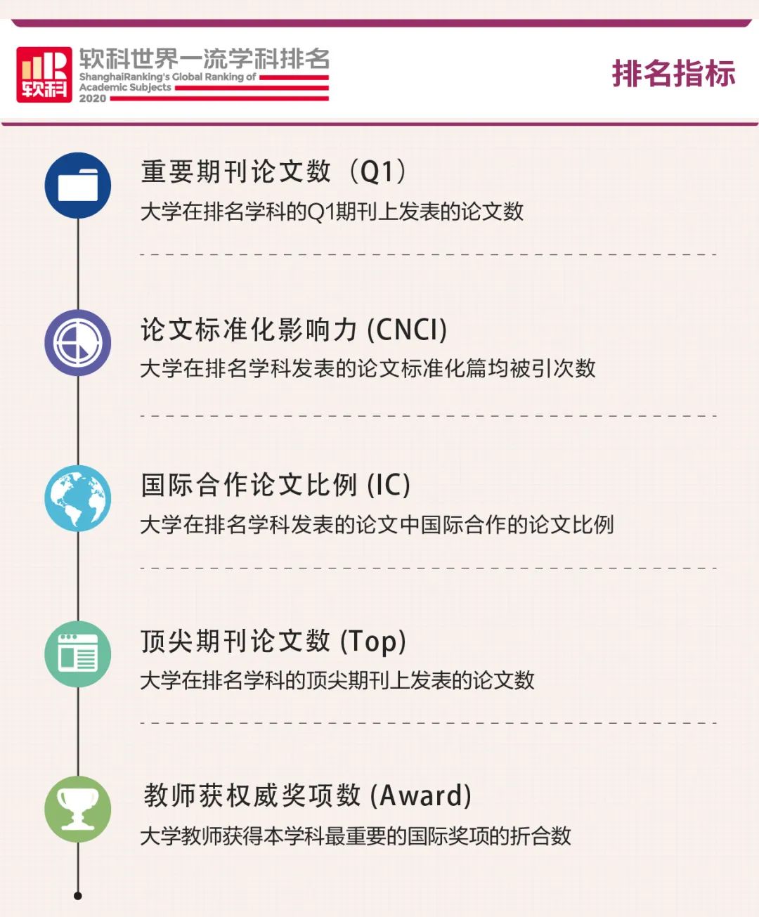 “软科世界一流学科排名”使用一系列国际可比的客观学术指标对全球大学在相关学科的表现进行测量,包括学科国际权威奖项、学科顶尖成果、科研质量、国际合作等。2020年,软科对评价体系进行了优化,使用“重要期刊论文数(Q1)”代替原“论文总数(PUB)”,用于测量被评价大学在相应学科的高水平科研产出。