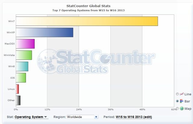 他们发现,支持触屏功能的Windows 8系统到现在为止,装机率仍少得可怜,只有4.69%。而于2009年发售的Windows 7仍是Windows家族的中坚力量,目前的装机率仍持有53.89%;其次则是Windows XP系统,其装机率有27.7%;而同样也为次时代的Vista其装机率也不理想,只有6.06%。