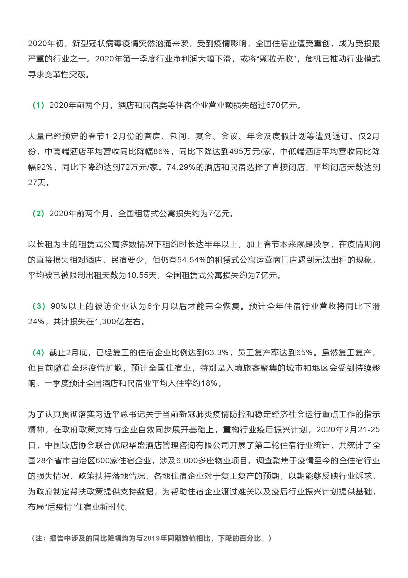 中国饭店协会、优尼华盛联合发布《新冠疫情对中国住宿行业的影响与趋势报告》。数据显示,受疫情影响一度停业的住宿企业正逐步复工。截至2月底,已经复工的住宿企业比例达到63.3%,员工复产率达到65%。2月21-25日,中国饭店协会联合企业开展住宿行业统计并形成该报告,其共统计全国28个省市自治区600家住宿企业,涉及6000多座物业项目。