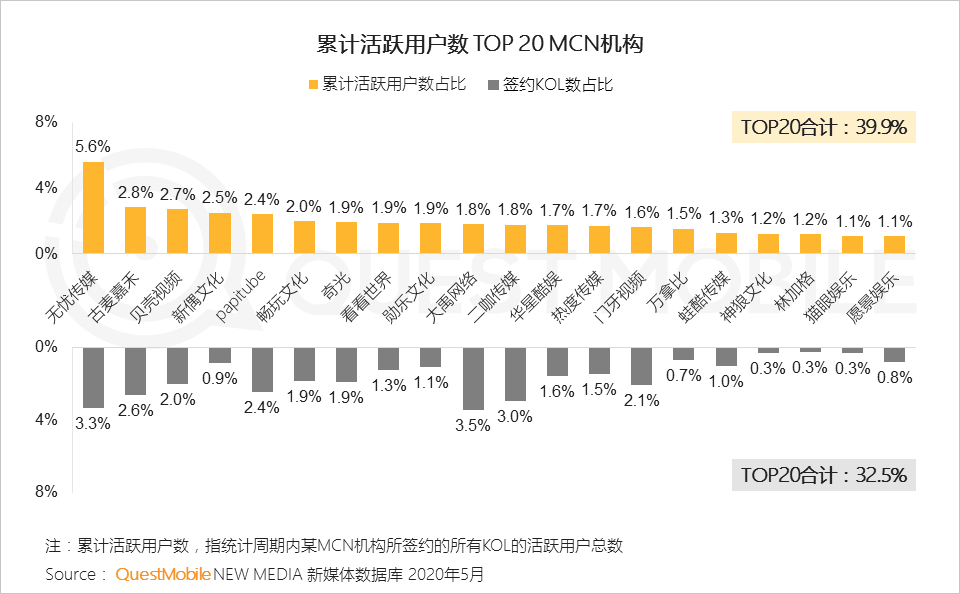 3、MCN已出现头部聚集效应,TOP20的MCN签约KOL数量占据总体的比例超过三成