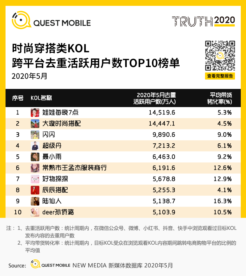 QuestMobile数据显示,美妆类KOL Top榜,李佳琦(1.13亿)、完美日记(1.06亿)、兰蔻(1.05亿)、瑜大公子(0.71亿)、冰老头(0.68亿);时尚穿搭类KOL Top榜,娃娃每晚7点(1.45亿)、大璇时尚搭配(1.44亿)、闪闪(0.99亿)、超级丹(0.72亿)、聂小雨(0.65亿);明星名人KOL Top榜,杨迪(1.90亿)、郑恺(1.85亿)、陈赫(1.72亿)、王祖蓝(1.38亿)、欧阳娜娜(1.25亿)。