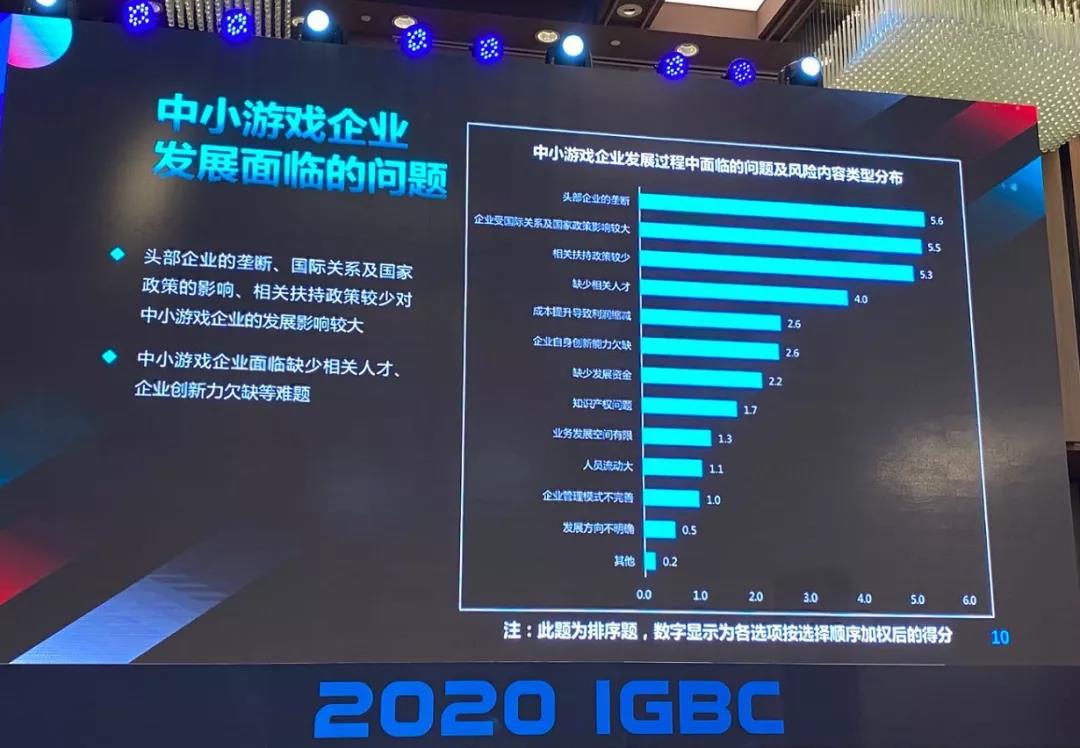 中小游戏企业在发展过程中面临问题最多的四个依次是:头部企业的垄断、国际关系及国家政策的影响、相关扶持政策较少以及缺少相关人才。这个和预设判断稍微有一些出入,我们当时想在人才、创新、发展空间、管理,融资等等会面临非常大困难,实际上现在看来外部环境是对中小企业影响最大,人才是中小企业重要因素。