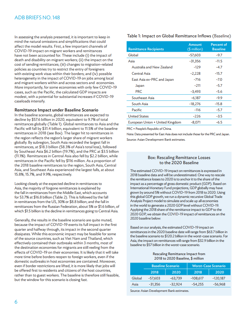 亚洲开发银行报告:预计2020年全球汇款因疫情减少1086亿美元 亚洲开发银行(简称“亚行”)周一表示,由于新冠疫情造成的失业增加以及雇主削减工资,今年全球汇款可能减少1086亿美元。 对亚洲的汇款可能减少543亿美元,或基线汇款规模的五分之一,来自亚洲的外籍劳工约占全球外籍劳工总数的三分之一。 亚行表示:“新冠病毒大流行病预计将严重打击亚洲及太平洋地区的汇款。” PDF版本将分享到199IT知识星球,扫描下面二维码即可! 更多阅读:全球汇款下降幅度超过经济衰退【附原数据表 】消费者品牌报告:寻找真相《福布斯》:2020年马斯克薪酬710亿元 成全球薪酬最高CEO中国人民银行:2019年第一季度城镇储户问卷调查报告Brand Finance:2025年房地产品牌25强2023年日本制造业白皮书概要亚洲开发银行:2023年亚洲发展展望(七月版)UNCTAD:2023年1-3月全球货物贸易同比增长1.9%2023年4月非洲脉搏:对影响非洲未来的问题分析世界银行:第三版全球集装箱港口绩效指数报告IMF:2023年4月财政监测报告下行的长期增长前景:趋势、期望和政策报告美国城市协会:2022年城市报告WTO:2022年世界关税报告NAR:美国楼市的“双重烦恼”