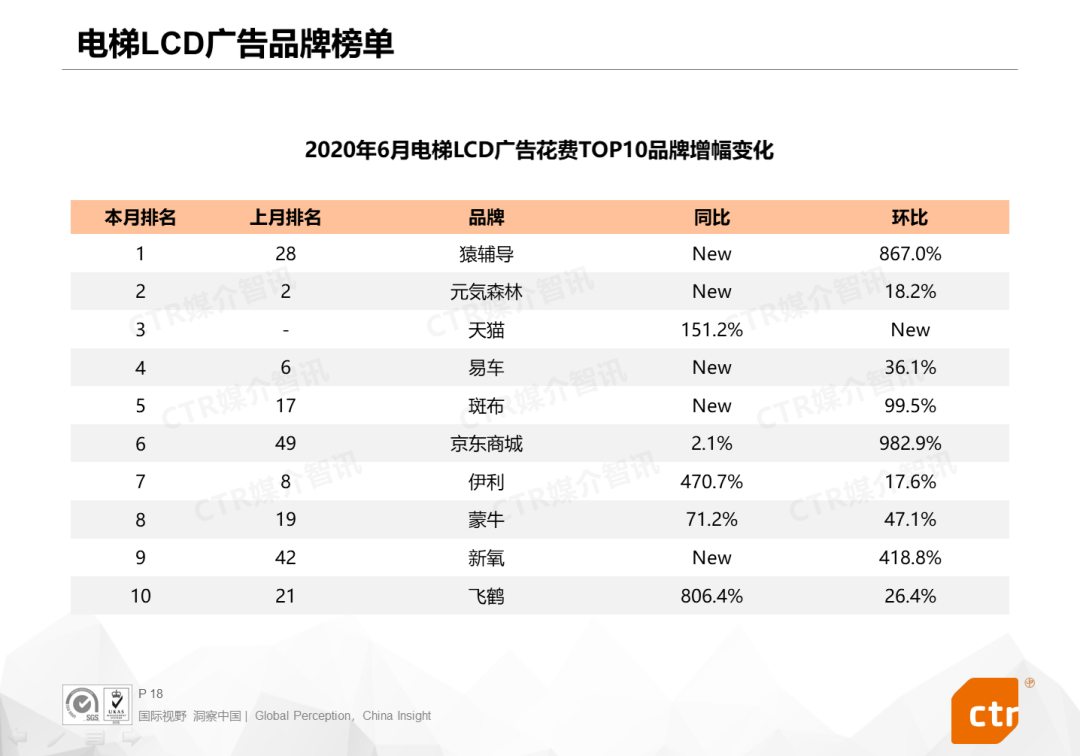 邮电通讯行业6月份增投电梯广告。其在电梯LCD的广告花费同比上涨61.9%,电梯海报广告增长120.9%。6月正值多个电商品牌的年中大促,因此天猫、苏宁易购、京东商城几大主要的电商网站增加了电梯广告投放。此外,学而思网校、猿辅导这类教育网站品牌也在电梯广告投放较多。