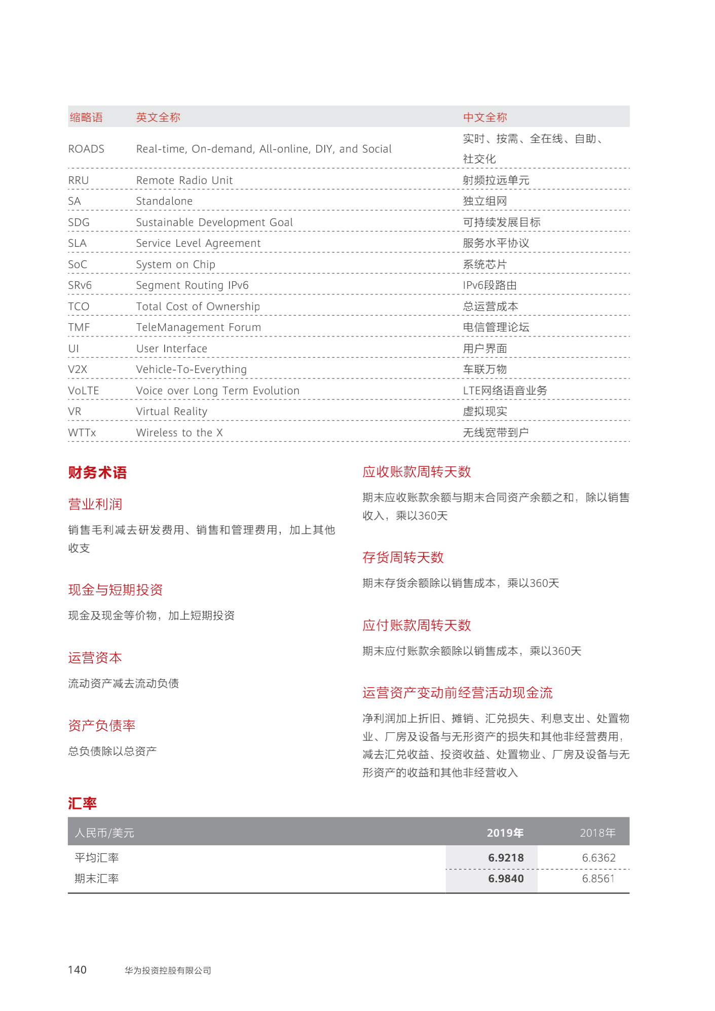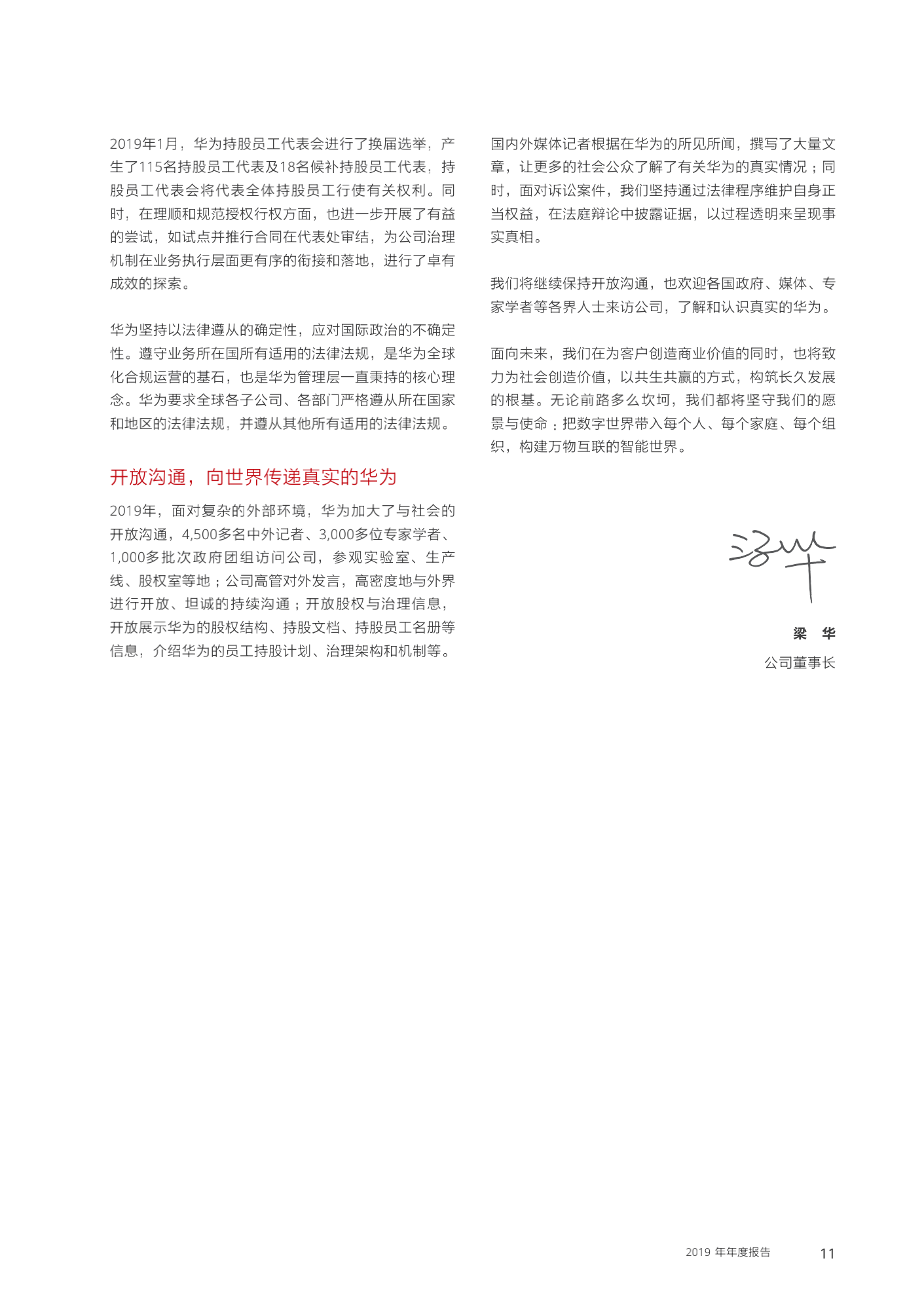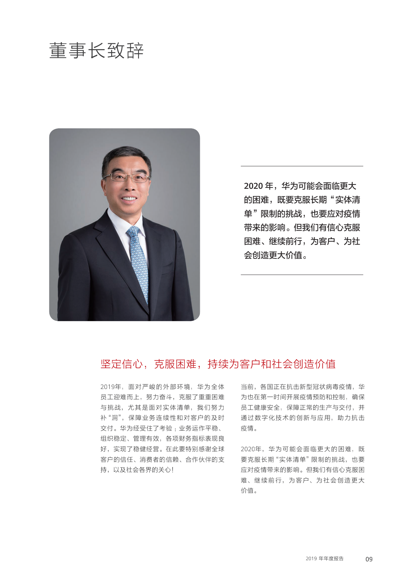 2019年对华为来说是不平凡的一年,在极为严苛的外部挑战下,全体华为员工团结一致,聚 焦为客户创造价值,赢得广大客户和伙伴的尊 重和信任。2019年,华为实现销售收入8,588 亿人民币,同比增长19.1%,实现净利润627 亿人民币,经营性现金流914亿人民币,公司 整体经营稳健。 运营商业务引领全球5G商用进程,在欧洲与运 营商一起设立了5G联合创新中心,持续推动 和促进5G商用和应用创新。我们的RuralStar 系列解决方案已累计为超过50个国家和地区 的4,000多万偏远区域人口提供移动互联网服 务。企业业务助力行业客户数字化转型,打造 数字世界底座。全球已有700多个城市、世界 500强企业中的228家,选择华为作为其数字化 转型的伙伴。消费者业务保持稳健增长,智能 手机发货量超过2.4亿台,PC、平板、智能穿 戴、智慧屏等以消费者为中心的全场景智慧生 活战略布局进一步完善。 借此机会,对客户、合作伙伴和员工表示衷心 的感谢!我们唯有持续提升产品和服务的竞争 力,创造出更大的价值,才能回报大家的厚爱。