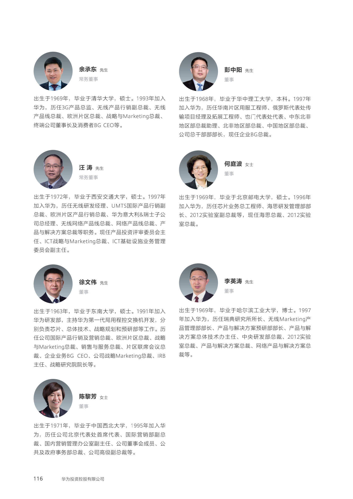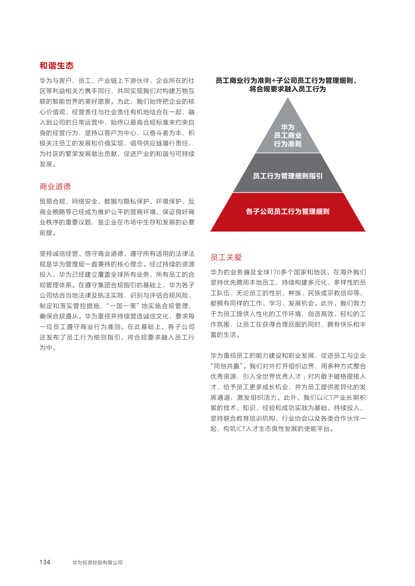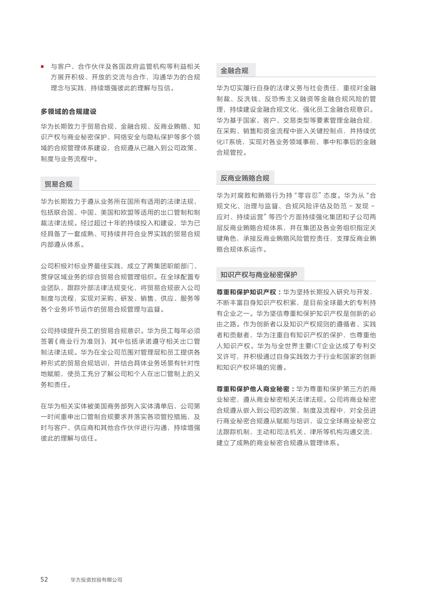 ■ 遵守所有适用的法律法规是公司管理层一直秉持的 核心理念,也是华为全球化合规运营的基石。我们 要进一步加强网络安全与隐私保护,确保对当地法 律法规的遵从。 我们的愿景和使命是把数字世界带入每个人、每个家 庭、每个组织,构建万物互联的智能世界。为实现这一 远大目标,我们将持续聚焦ICT基础设施和智能终端,开 放合作,与伙伴一起使能各个行业的数字化、智能化, 为客户和社会创造更大的价值,让所有人都从中受益。