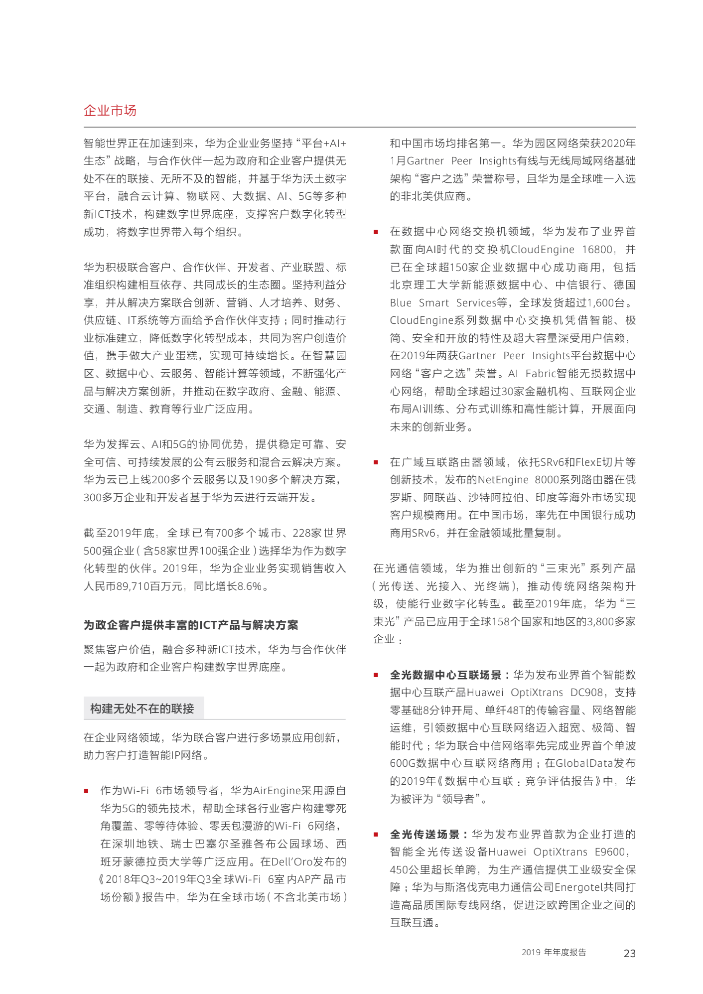 ■ 以超大带宽、超低时延、海量联接为特征的5G技 术,将为消费者带来极致体验,助力各行各业加速 数字化、智能化进程,为社会和经济发展提供新动 能。我们将积极推进全球5G发展,抓住5G发展带来 的网络建设机会,使能千行百业,联合行业的领先 企业构建可大规模复制的5G行业应用,繁荣5G生 态,助力运营商和各行业伙伴的商业成功,创造更 大的商业和社会价值。 随着企业数字化转型加速,越来越多的企业需要部 署更大带宽、服务等级协议可承诺、可智能运维 的智能IP网 络。2019年, 我 们 发 布 了 基 于AI的5G 综合承载网络、智能无损数据中心网络和全无线 园区网络等一系列解决方案。此外,我们还发布了 AirEngine Wi-Fi 6、CloudEngine数据中心交换机、 NetEngine路由器和HiSecEngine防火墙等“四大引 擎”系列新产品。我们将持续创新投入、深入客户联 合创新,持续引领智能IP网络的发展和相关标准的 成熟。 与此同时,为推动光纤网络由带宽驱动走向体验驱 动,全产业充分沟通并达成广泛共识,共同推出第 五代固定网络(F5G)的定义和标准 :包括全光联 接、超高宽带和稳定体验三大特征。2019年,我们 发布了智简全光网战略,使华为光纤网络不仅为千 家万户提供极致体验,同时为千行百业提供更可 靠、更大带宽的联接服务,携手5G助力全行业数字 化转型。作为全球光通信产业的领导者,我们将长 期投入关键技术研究,为标准发展积极贡献。