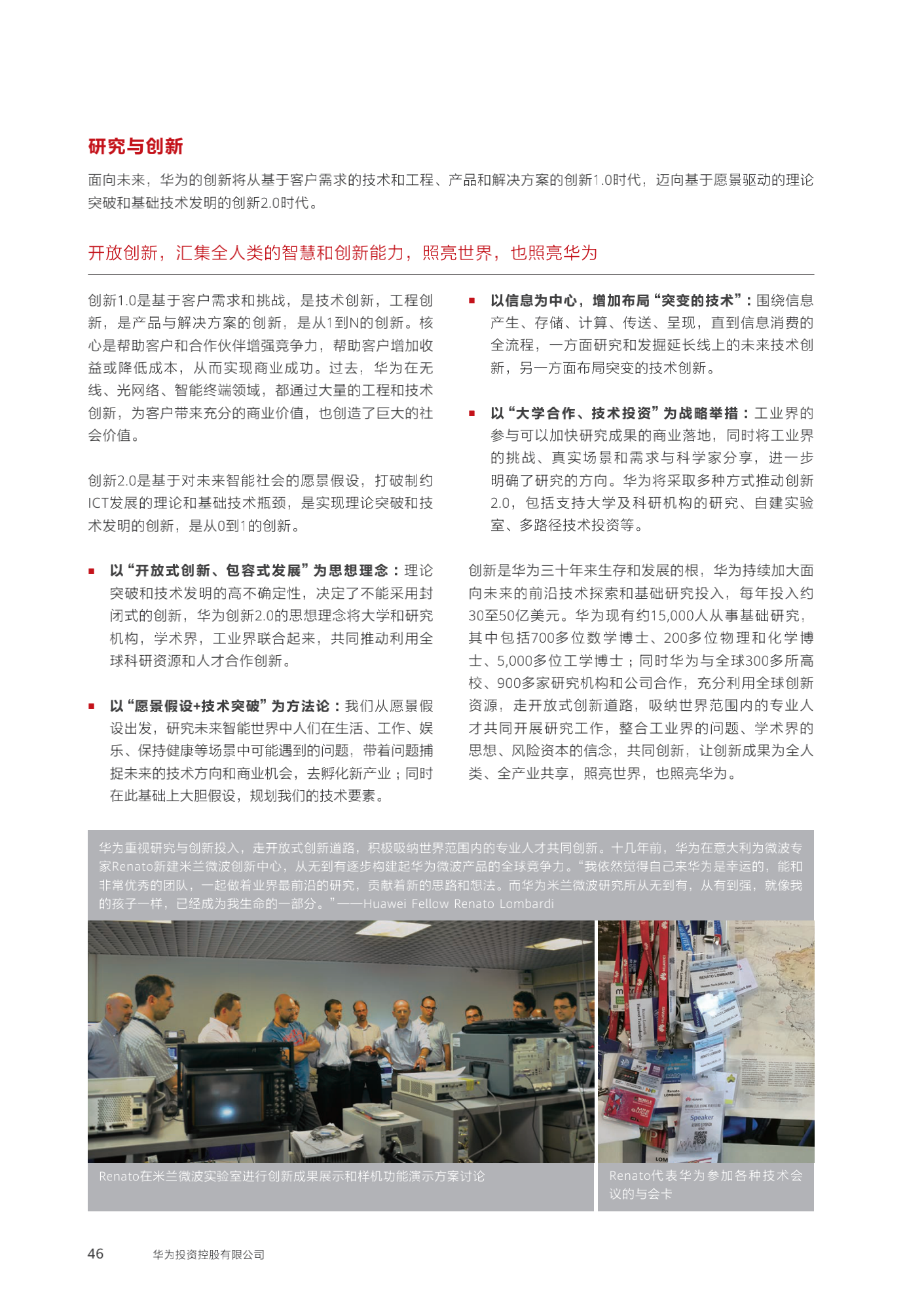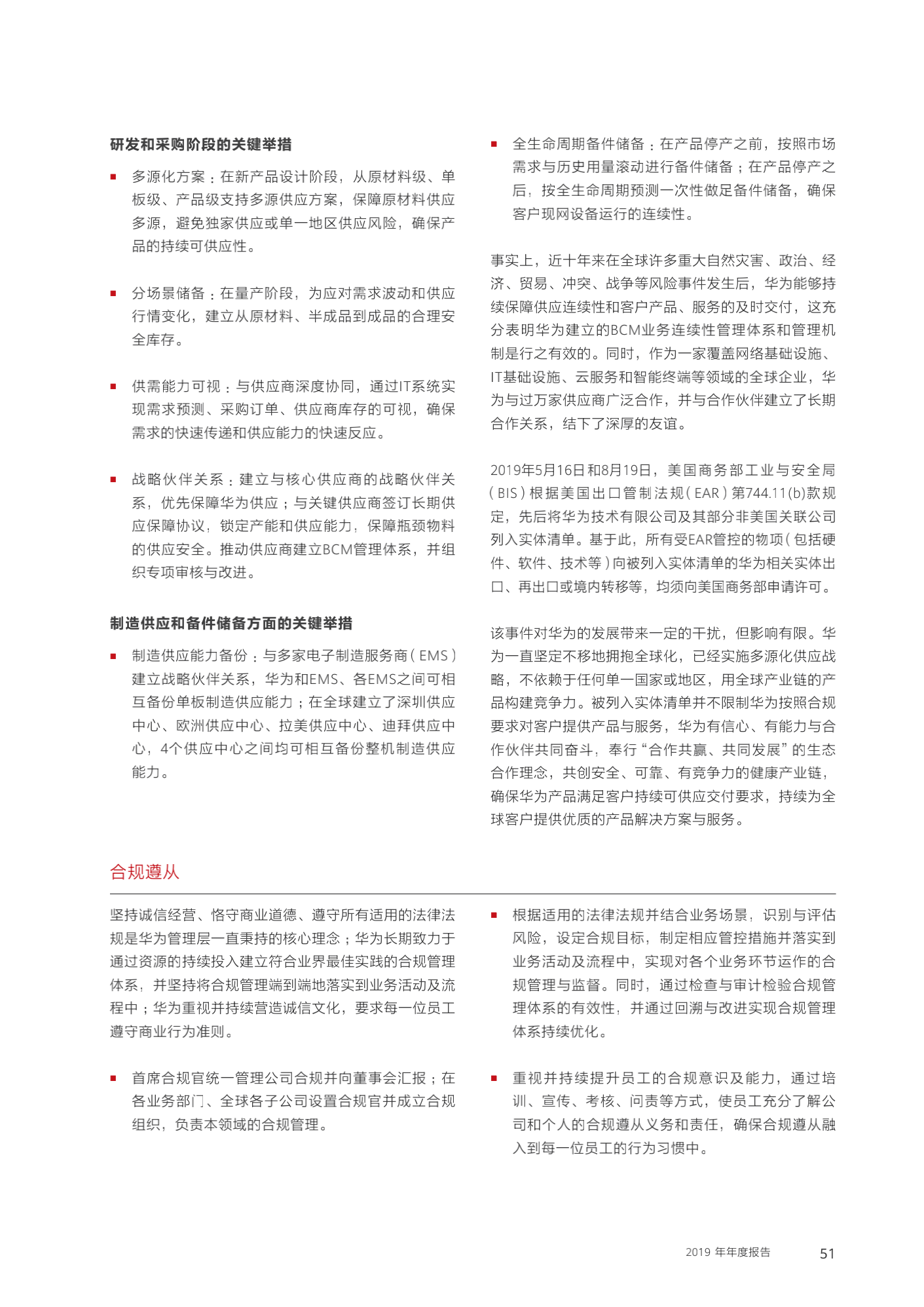 ■ 面向政府和企业客户,华为提供无处不在的联接、 无所不及的智能,并积极联合客户、合作伙伴、开 发者、产业联盟和标准组织打造行业数字平台和生 态,不断探索和开展行业数字化转型最佳实践,推 动政府、金融、能源、交通、制造、教育等行业数 字化,构建数字世界底座。 持续投入,迈向创新2.0时代 创新是华为三十年来生存和发展的根基。我们坚持将年 收入的10%以上投入到研发,近几年的投入比例更是超 过了14%,正是得益于长期的研发投入,才使得我们在 很多技术领域持续领先,才能在外界巨大的压力下赢得 客户的尊重和信任。我们将从基于客户需求的技术、工 程、产品和解决方案的创新1.0时代,迈向基于愿景驱动 的理论突破和基础技术发明的创新2.0时代。面向未来万 物互联的智能世界,打破制约ICT发展的理论和基础技术 瓶颈,实现理论突破和技术发明。 确保业务连续性 经过十多年的努力,华为已建立了一整套严密有效的业 务连续性管理体系,覆盖了从供应商到华为,从华为 到客户的端到端业务。过去一段时间,华为在“实体清 单”下依然保持增长,充分验证了管理体系的有效性。 同时,我们持续优化和完善业务连续性机制,长期坚持 “多元化、多路径”的采购策略。目前我们的主力产品供 应都有多元化方案,无论外部环境如何变化,我们都有 信心确保对客户的供应、交付和服务。 加强网络安全与隐私保护,遵守所有适用 的法律法规