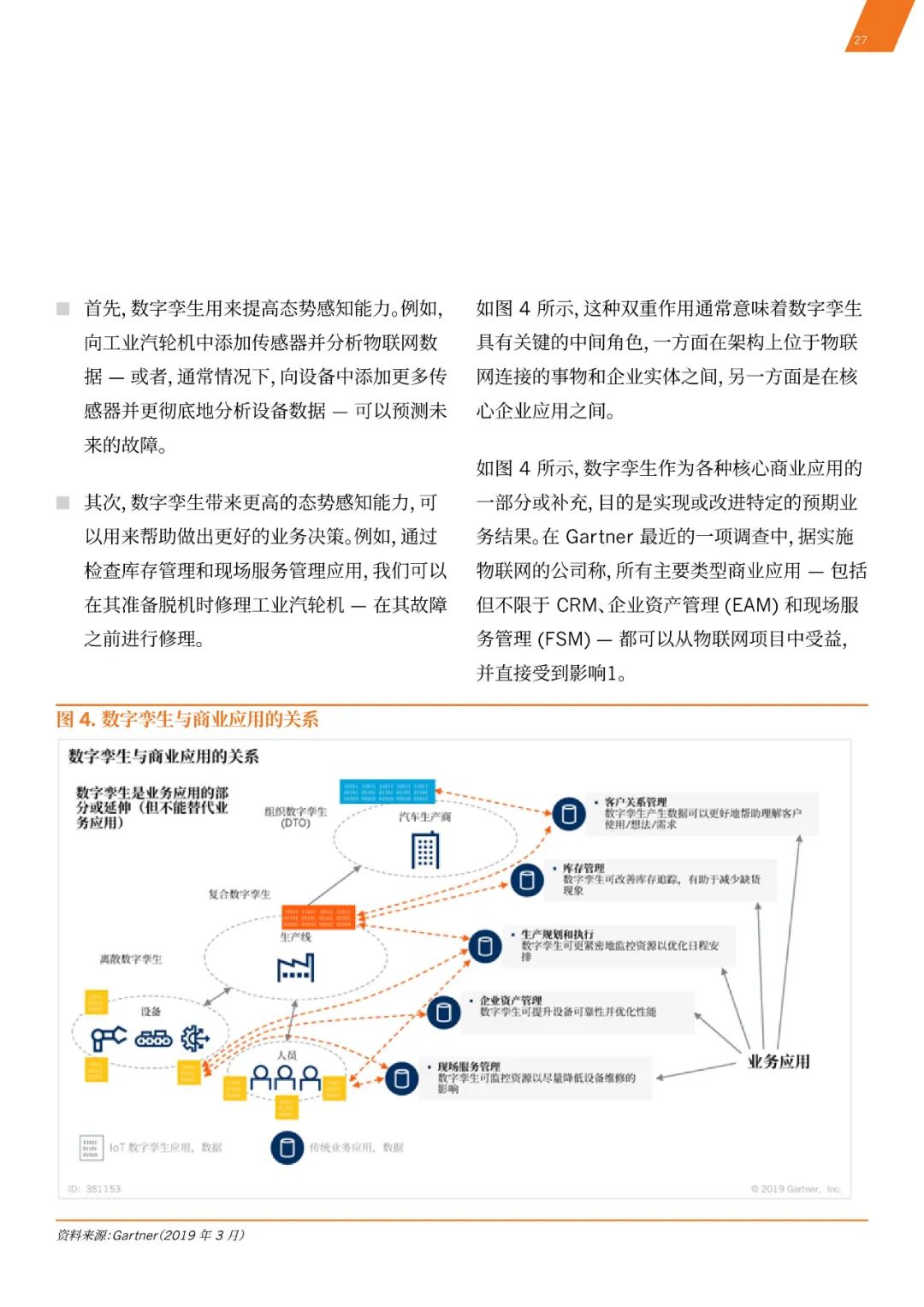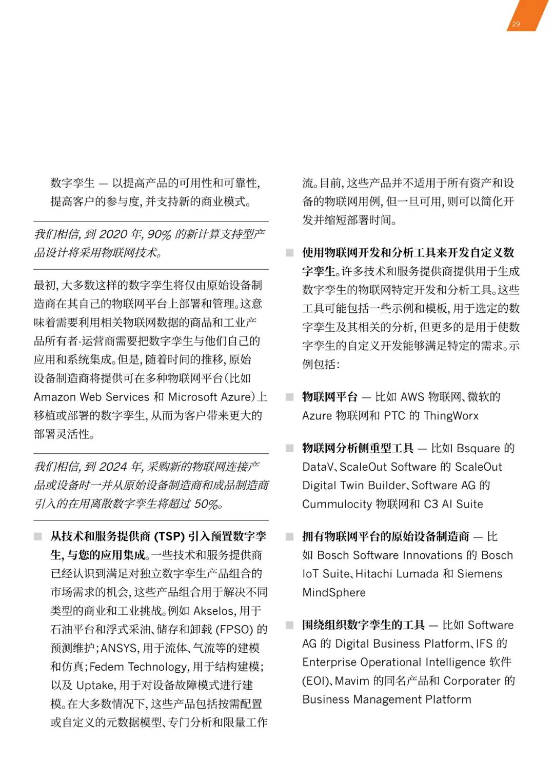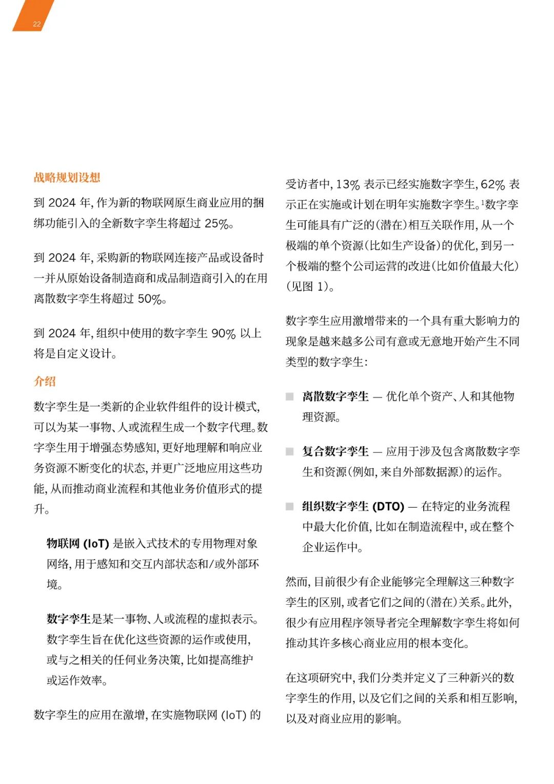 《白皮书》预测,数字孪生将会是未来企业实现转型与创造价值的重要驱动力。到2021年,半数的大型工业企业将使用数字孪生,从而使这些企业的效率提高10%。到2024年,超过25%的全新数字孪生将作为新loT原生业务应用的绑定功能被采用。