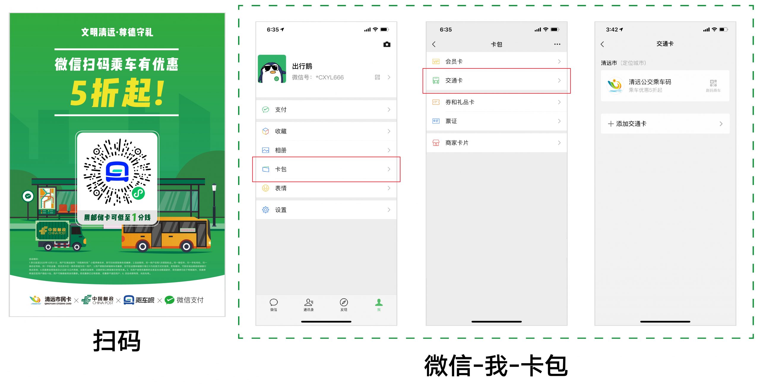 市民在首次使用时,可通过微信卡包-交通卡-添加交通卡-添加清远公交乘车码,开通免密支付,即可使用微信支付刷码乘车。再次使用时,只需打开微信卡包-交通卡,即可快速调出清远公交乘车码,享受“先乘车、后付费”的快速出行体验。