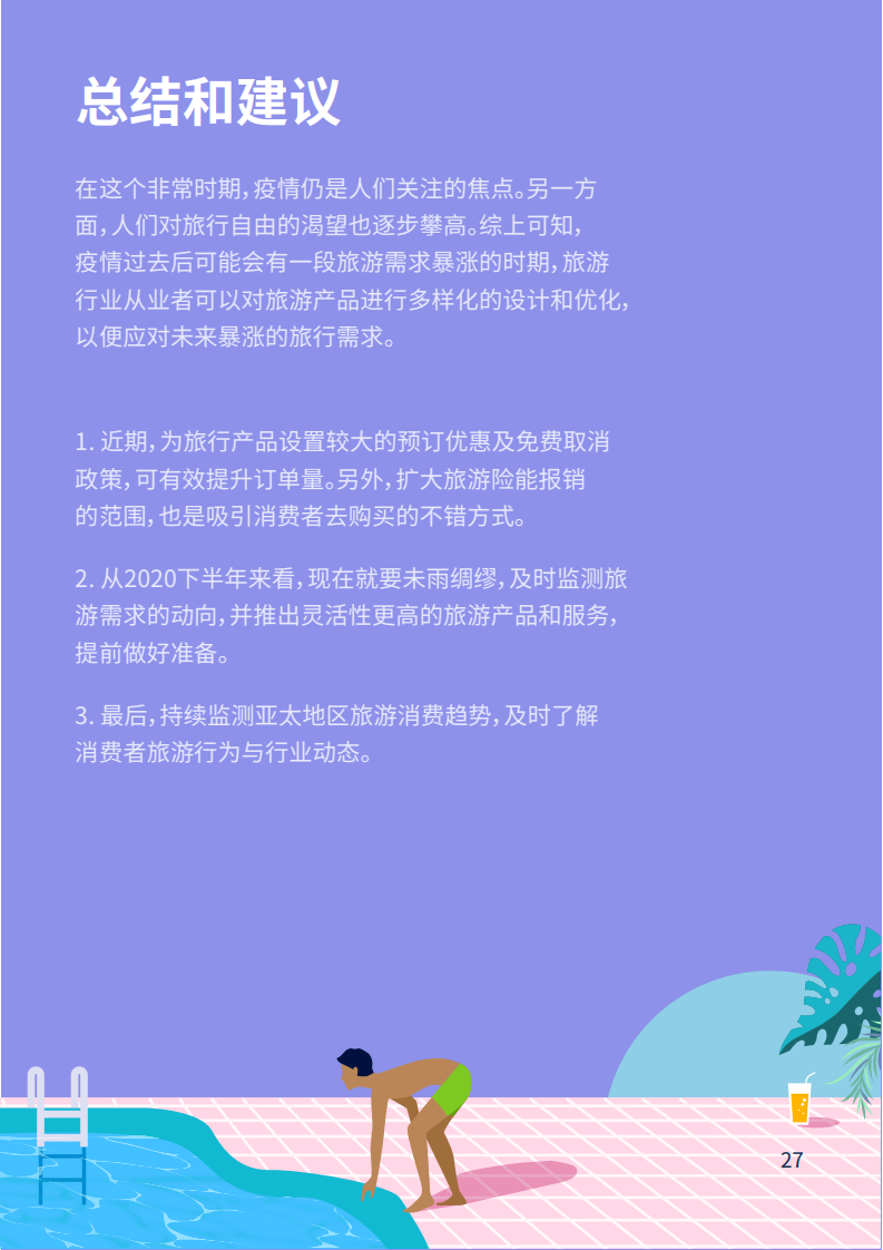 2、 从2020下半年来看,现在就要未雨绸缪,及时监测旅游需求的动向,并推出灵活性更高的旅游产品和服务,提前做好准备。