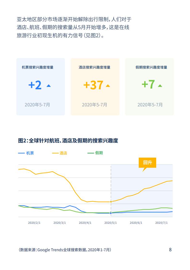 2020年上半年,全球范围内对于旅游相关话题的搜索兴趣曾陷入谷底,但目前已呈现明显增长迹象。5月份开始,消费者对旅游话题的兴趣度持续回升。7月开始,消费者对于旅游品类的部分需求,例如假期需求,已经回归去年同期水平。