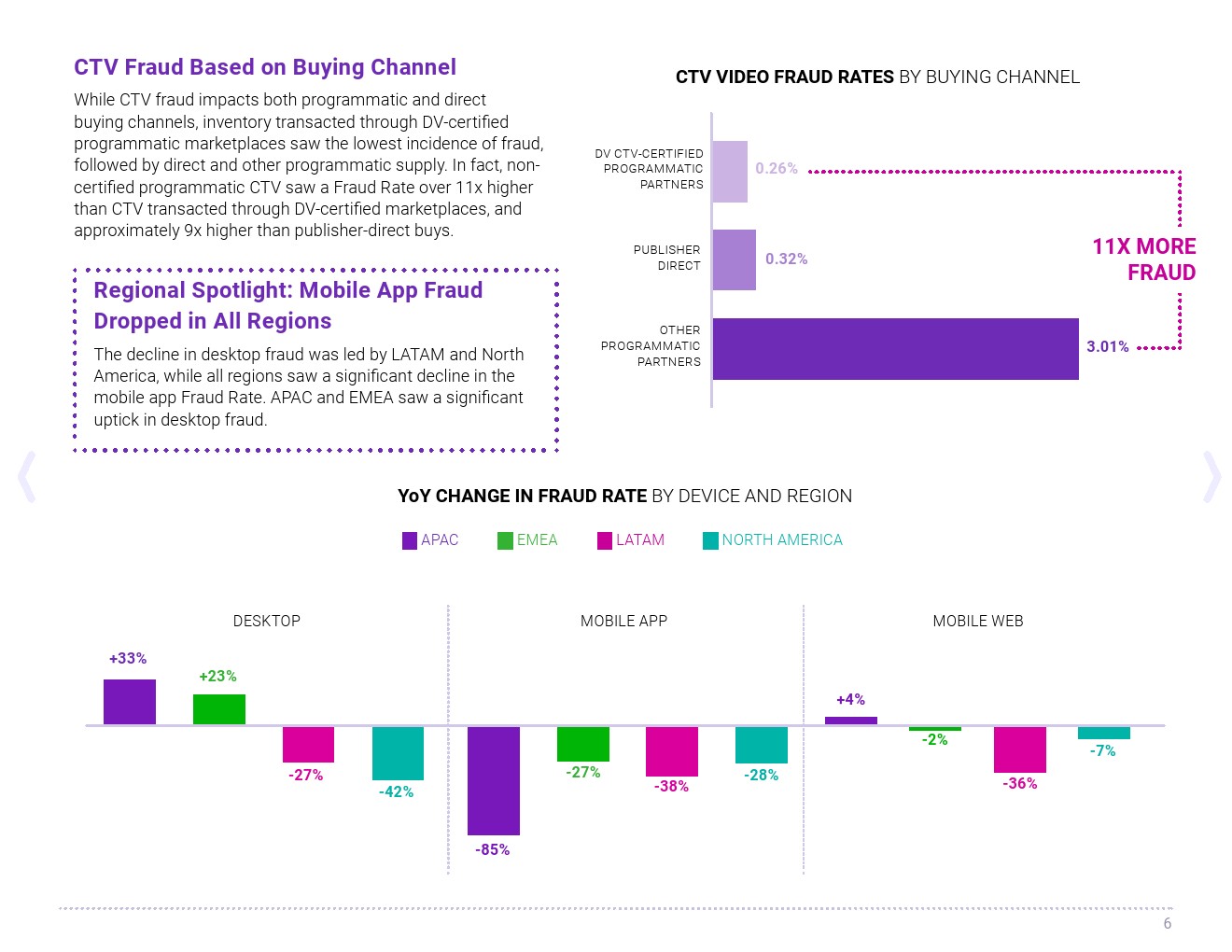 亚太地区整体品牌适用性的大幅增加归功于该地区最初专注于减少网站、应用程序和联网电视(CTV)上的广告欺诈。有趣的是,亚太地区的移动应用广告流量欺诈率显着下降(-85%),但PC欺诈率大幅上升(+33%)。