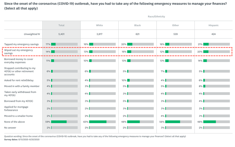 据SurveyMonkey最新调查显示,新冠疫情以来,14%的美国人(多达4600万人)表示他们已经耗尽了应急储蓄,另有11%的人不得不借钱来支付日常开支,还有一些人停止缴纳养老保险。