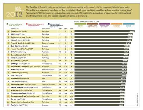 2012 年度的 Davis BrandCapital 品牌排行榜主要衡量了公司管理和平衡五个关键而又无形的范畴的能力,这些范畴共同形成了品牌资产:品牌价值;竞争力表现;创新力度;企业文化以及社会影响力。这份排名并不是要给这些公司的品牌资产对应的财物价值给出一个排名反映它们的品牌资产所对应的实力和广度。苹果公司排名上升的主要原因是其竞争优势和增加的品牌价值。