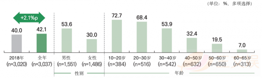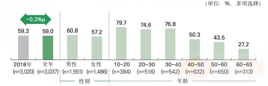 虽然手机游戏在2018年和2019年的整体销售额成绩亮眼,但用户使用率却有所减少,从2018年的59.3%减少为59.0%。