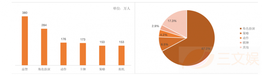 在韩国日活量最大的游戏是益智类的游戏,日活为380万,在这之后是角色扮演类游戏284万,动作类游戏176万。销量方面,从上图中也可以看出角色扮演类游戏以67.2%的比重稳居榜首,之后是策略类游戏8.5%,动作游戏4.2%。