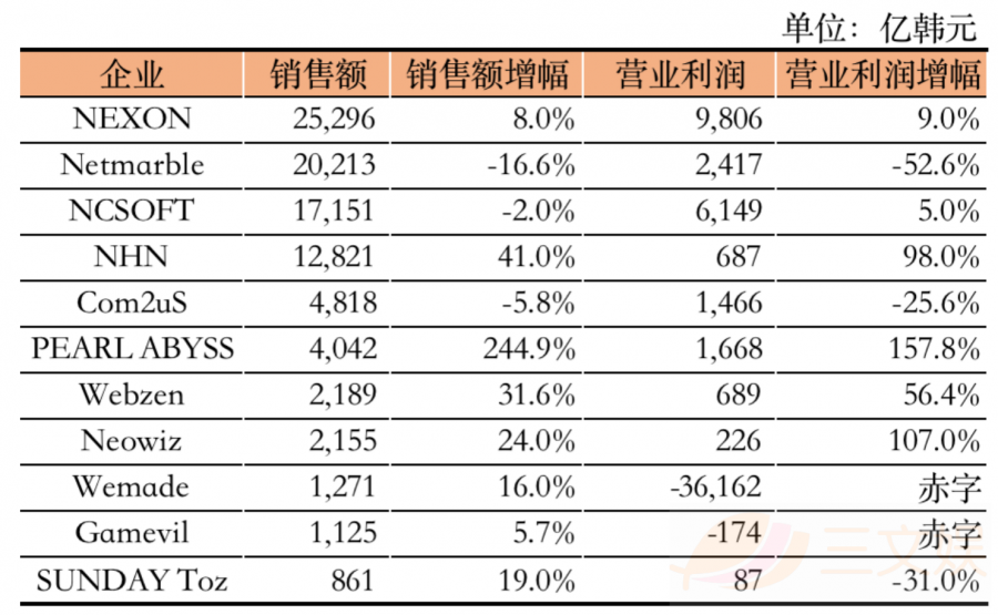 比如,NEXON以《枫叶冒险岛》《地下城与勇士》拿下了近2.53兆韩元的销售额成为2018年游戏公司的销量冠军;年销售额实现了2.0兆韩元的Netmarble虽然发行了《天堂2革命》但营业利润仍旧以-52.6%的增幅减少至2417亿韩元,营业利润排名第三;同一个IP不同的游戏的《天堂M》的发行公司NCSOFT,却凭借着该游戏实现了营业利润增长5.0%,达到6149亿韩元,全年的销售额则超过了1.7兆韩元;《黑色沙漠》的发行公司PEARL ABYSS却以244.9%的增幅实现了4042亿韩元的销售额,营业利润也以157.8%的增幅实现1668亿韩元。